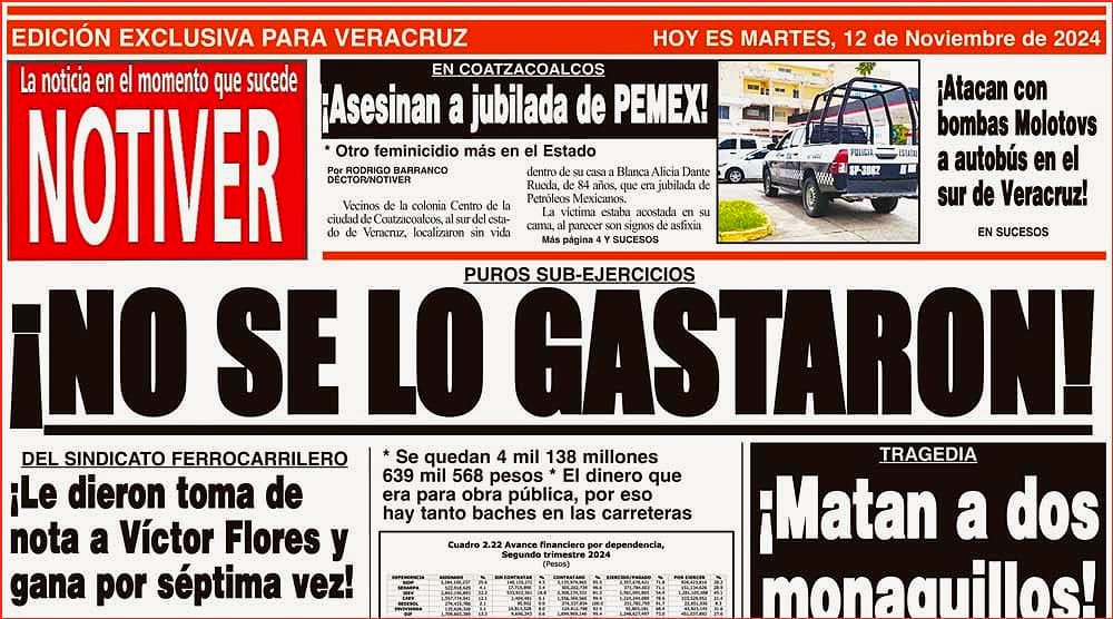 PRIMERA LA PORTADA - MARTES 12 DE NOVIEMBRE 2024 PUROS SUB-EJERCICIOS - *SE QUEDAN 4 MIL 138 MILLONES 639 MIL 568 PESOS *EL DINERO QUE ERA PARA OBRA PÚBLICA, POR ESO HAY TANTO BACHES EN LAS CARRETERAS 12 noviembre 2024