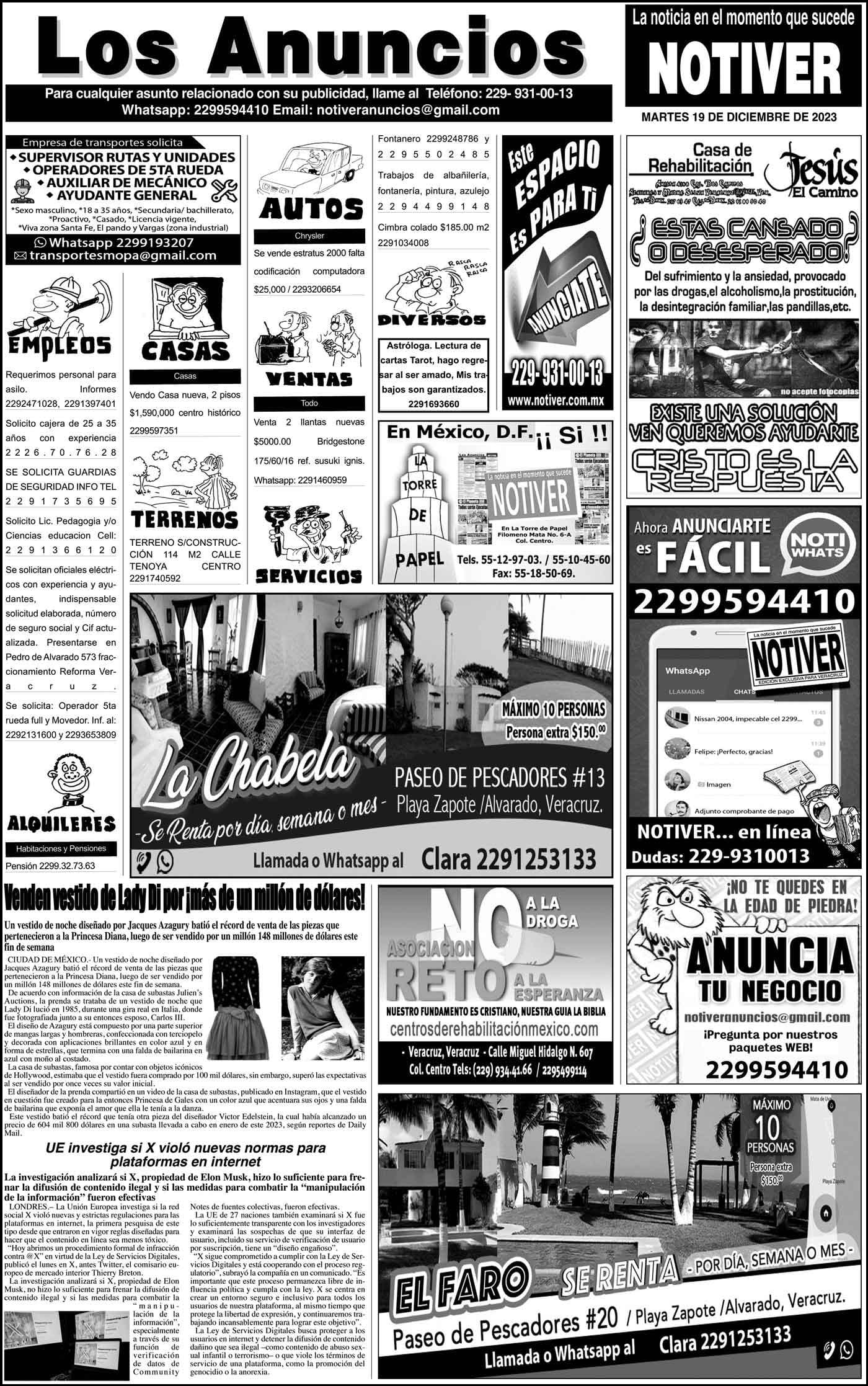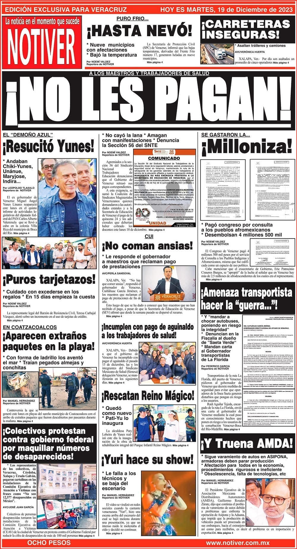 PRIMERA LA PORTADA - MARTES 19 DE DICIEMBRE 2023 A LOS MAESTROS Y TRABAJADORES DE SALUD - * NO CAYÓ LA LANA * AMAGAN CON MANIFESTACIONES * DENUNCIA LA SECCIÓN 56 DEL SNTE 19 diciembre 2023 Y LOS ANUNCIOS...Cotice su Anuncio Su Correo Electrónico: Texto: Enviar