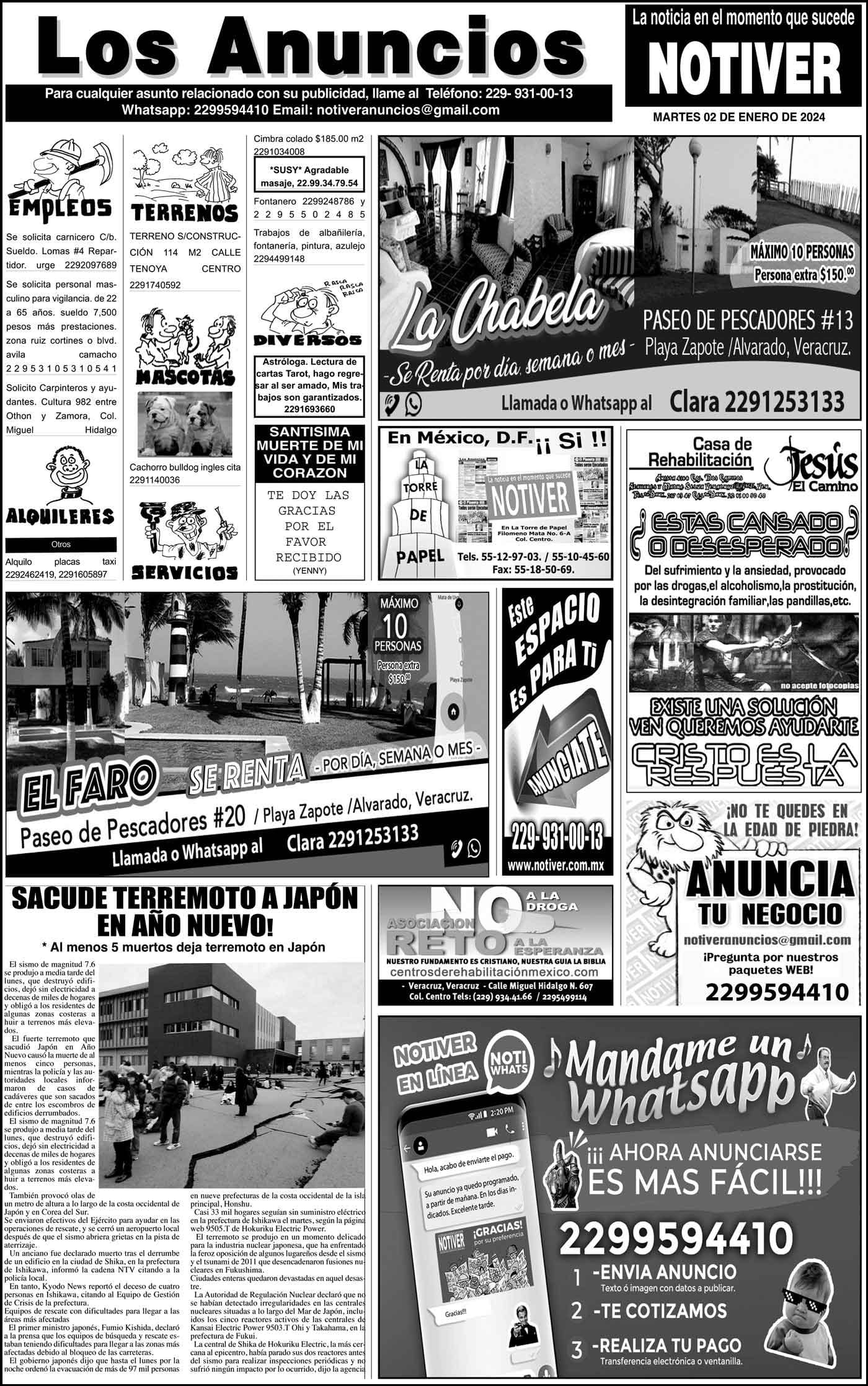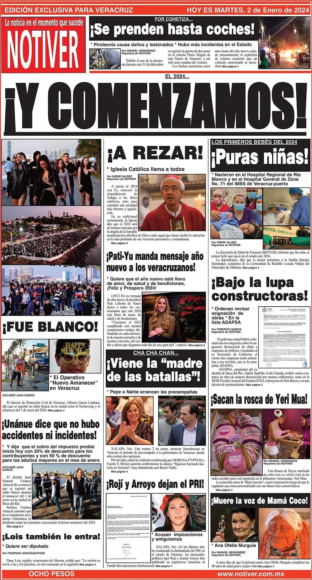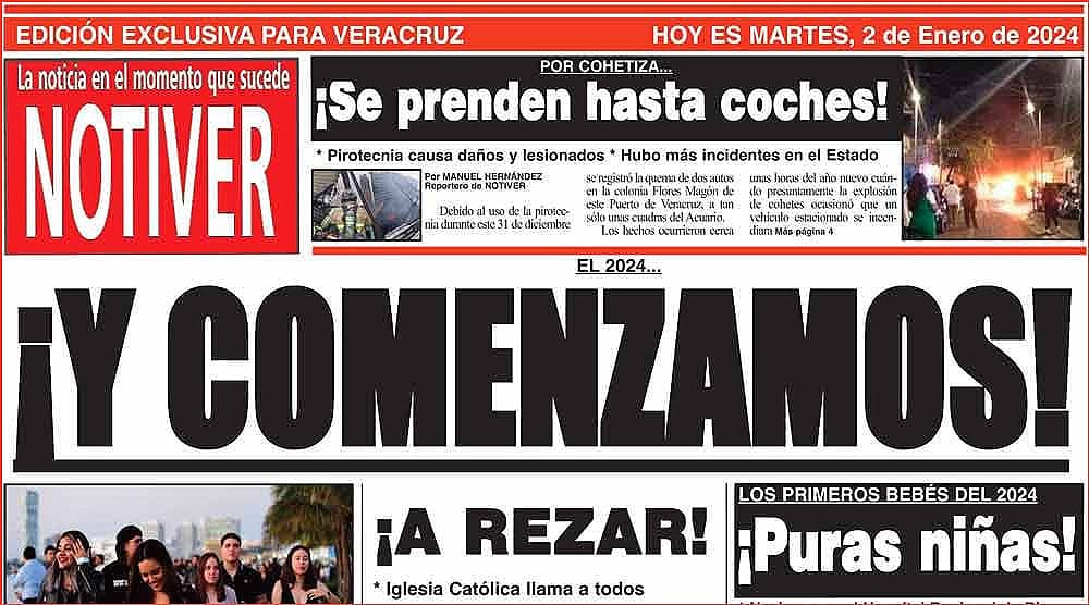 PRIMERA LA PORTADA - MARTES 2 DE ENERO 2024 EL 2024... - ¡FUE BLANCO! * EL OPERATIVO “NUEVO AMANECER” EN VERACRUZ 2 enero 2024 Y LOS ANUNCIOS...Cotice su Anuncio Su Correo Electrónico: Texto: Enviar