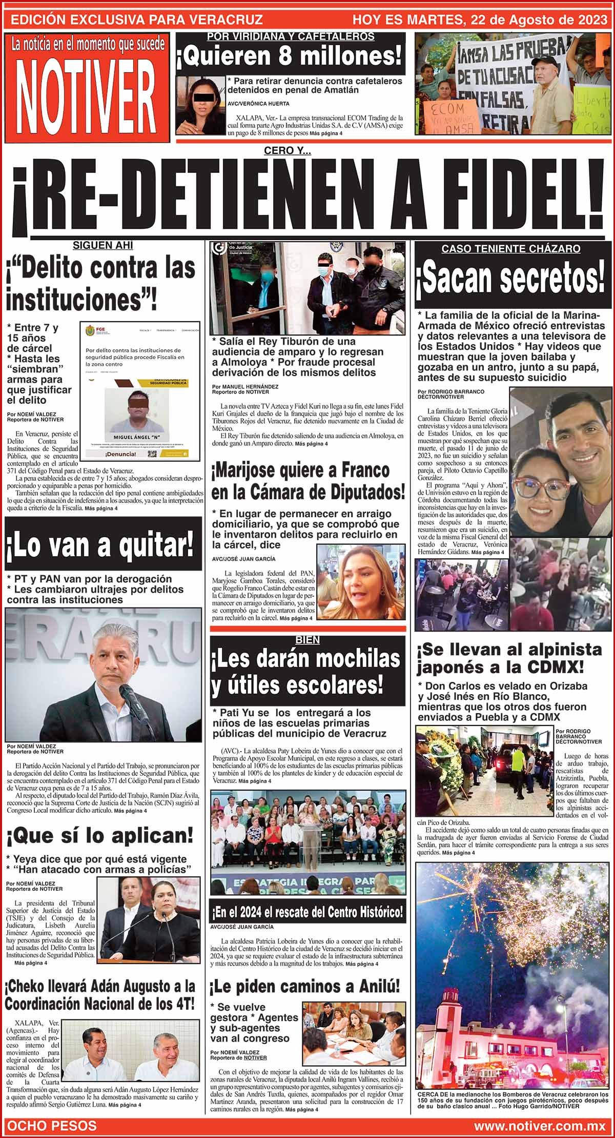 PRIMERA LA PORTADA - MARTES, 22 DE AGOSTO 2023 * SALÍA EL REY TIBURÓN DE UNA AUDIENCIA DE AMPARO Y LO REGRESAN A ALMOLOYA * POR FRAUDE PROCESAL DERIVACIÓN DE LOS MISMOS DELITOS 22 agosto 2023 Y LOS ANUNCIOS... Más Noticias ¡LA DEFIENDE ESTEBAN! - *Condena las criticas del papá de Cui ¡14 AÑOS SIN REGINA! - *Y no hay justicia ¡MUERE LUIS MUSLERA! - “EL CROMO” LOS CARTONES ¡RESCATAN 101 HUEVOS DE TORTUGA LORA! ¡AUMENTAN FUGAS DE GAS! - *Cuatro a 5 servicios diarios, por la ola de calor ¡Y LO TUNDEN! - A ATANASIO ¡BERTHA PIDE LICENCIA! ¡NAHLE REVIRA! - *“Yo ando trabajando”, dice tras polémica por críticas de Atanasio ¡NO LE GUSTÓ A ROSA! - *No abonan a la unidad y solo benefician a quienes buscan la división