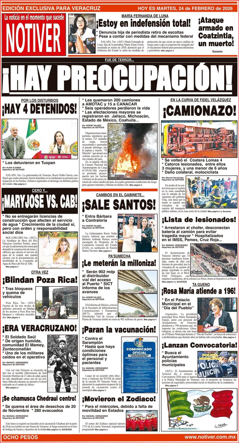 PRIMERA LA PORTADA - MARTES 24 DE FEBRERO 2026 FUE DE TERROR... - *LES QUEMARON 200 CAMIONES A AMOTAC Y 15 A CANACAR *SEIS OPERADORES PERDIERON LA VIDA *LAS AFECTACIONES MAYORES SE REGISTRARON EN JALISCO, MICHOACÁN, ESTADO DE MÉXICO, COAHUILA... 24 febrero 2026