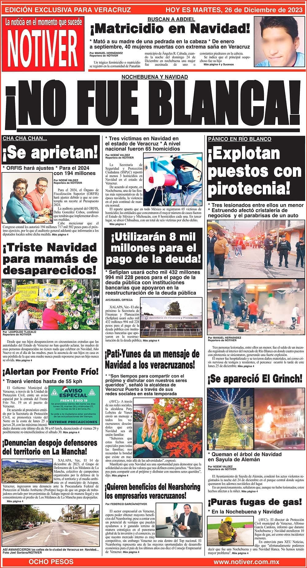 PRIMERA LA PORTADA - MARTES 26 DE DICIEMBRE 2023 NOCHEBUENA Y NAVIDAD - * TRES VÍCTIMAS EN NAVIDAD EN EL ESTADO DE VERACRUZ * A NIVEL NACIONAL FUERON 65 HOMICIDIOS 26 diciembre 2023 Y LOS ANUNCIOS...Cotice su Anuncio Su Correo Electrónico: Texto: Enviar