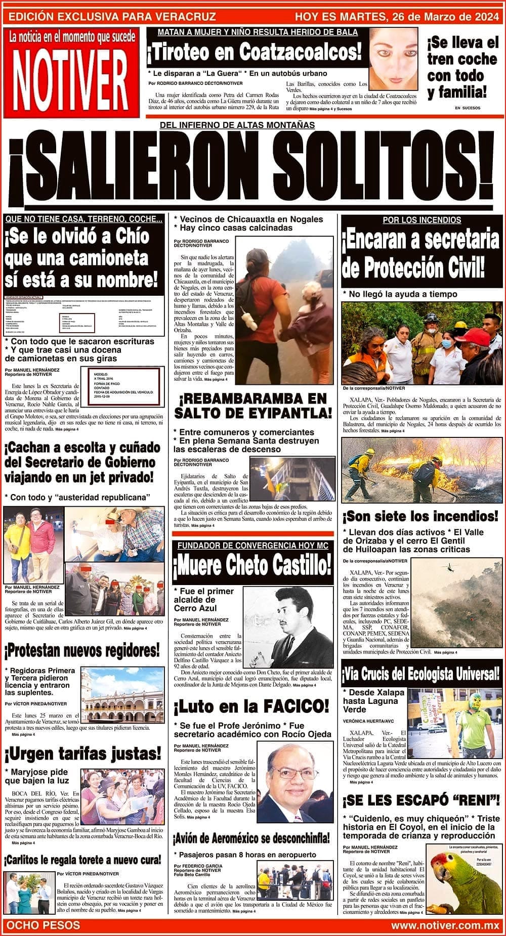 PRIMERA LA PORTADA - MARTES 26 DE MARZO 2024 DEL INFIERNO DE ALTAS MONTAÑAS - * VECINOS DE CHICAUAXTLA EN NOGALES * HAY CINCO CASAS CALCINADAS 26 marzo 2024 Y LOS ANUNCIOS...Cotice su Anuncio Su Correo Electrónico: Texto: Enviar