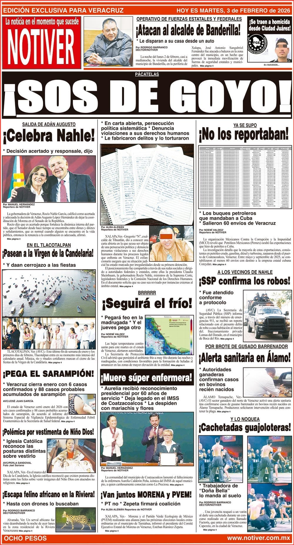 PRIMERA LA PORTADA - MARTES 3 DE FEBRERO 2026 PÁCATELAS - *EN CARTA ABIERTA, PERSECUCIÓN POLÍTICA SISTEMÁTICA *DENUNCIA VIOLACIONES A SUS DERECHOS HUMANOS *LE FABRICARON DELITOS Y LO TORTURARON 3 febrero 2026
