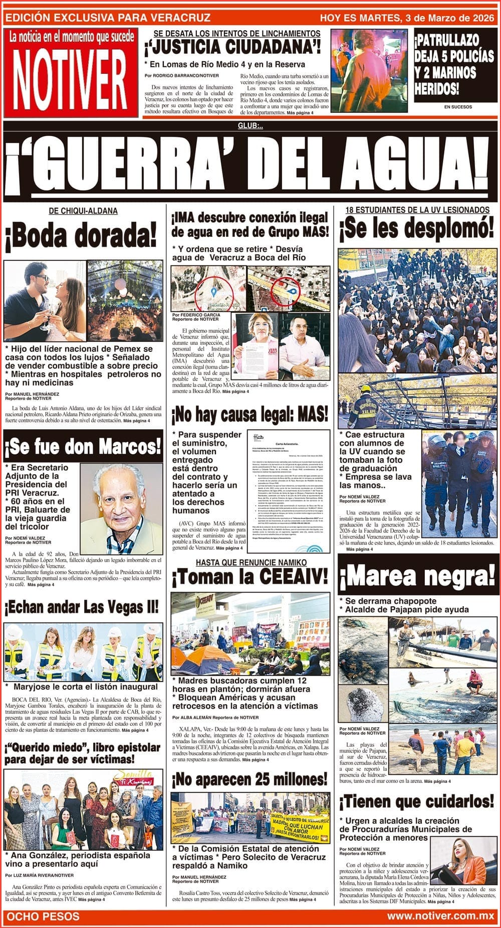 PRIMERA LA PORTADA - MARTES 3 DE MARZO GLUB:… - *IMA descubre conexión ilegal de agua en red de Grupo MAS! *Y ordena que se retire *Desvía agua de Veracruz a Boca del Río 3 marzo 2026