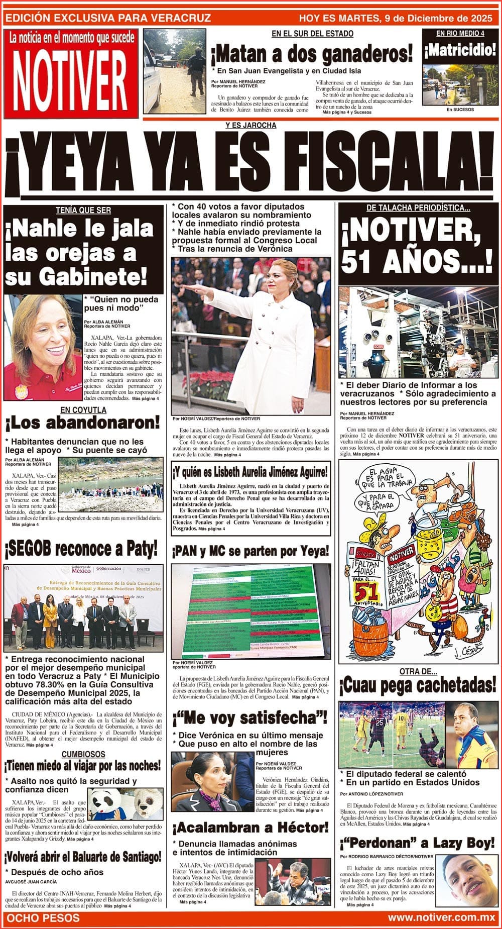 PRIMERA LA PORTADA - MARTES 9 DE DICIEMBRE 2025 Y ES JAROCHA - *CON 40 VOTOS A FAVOR DIPUTADOS LOCALES AVALARON SU NOMBRAMIENTO *Y DE INMEDIATO RINDIÓ PROTESTA *NAHLE HABÍA ENVIADO PREVIAMENTE LA PROPUESTA FORMAL AL CONGRESO LOCAL *TRAS LA RENUNCIA DE VERÓNICA 9 diciembre 2025