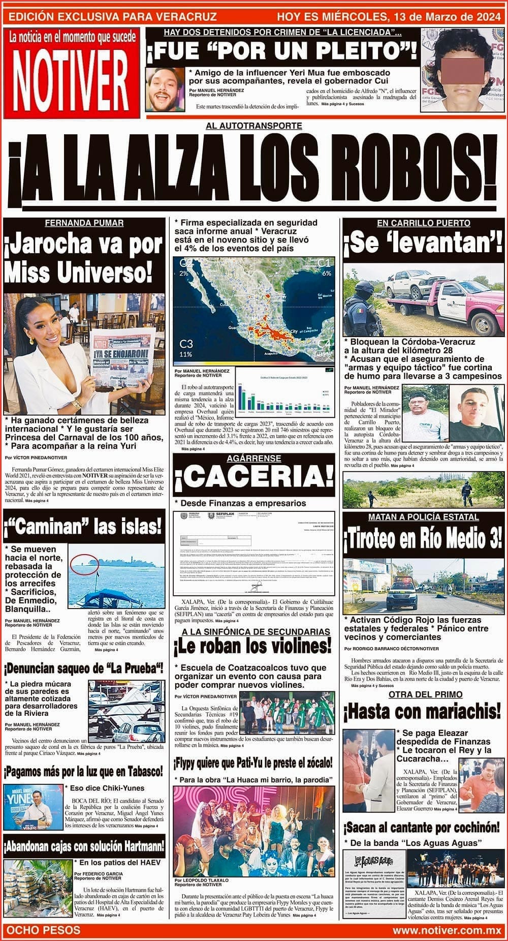 PRIMERA LA PORTADA - MIÉRCOLES 13 DE MARZO 2024 AL AUTOTRANSPORTE - * FIRMA ESPECIALIZADA EN SEGURIDAD SACA INFORME ANUAL * VERACRUZ ESTÁ EN EL NOVENO SITIO Y SE LLEVÓ EL 4% DE LOS EVENTOS DEL PAÍS 13 marzo 2024 Y LOS ANUNCIOS...Cotice su Anuncio Su Correo Electrónico: Texto: Enviar