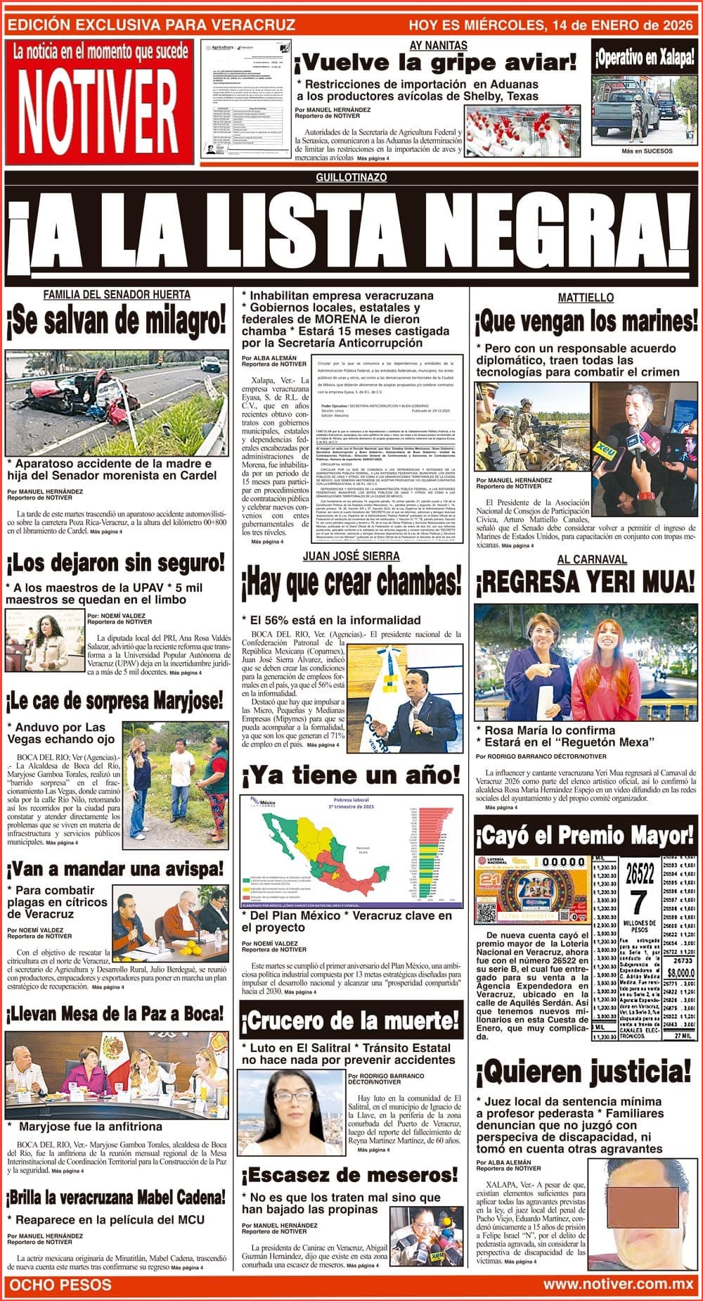 PRIMERA LA PORTADA - MIÉRCOLES 14 DE ENERO 2026 GUILLOTINAZO - *INHABILITAN EMPRESA VERACRUZANA *GOBIERNOS LOCALES, ESTATALES Y FEDERALES DE MORENA LE DIERON CHAMBA *ESTARÁ 15 MESES CASTIGADA POR LA SECRETARÍA ANTICORRUPCIÓN 14 enero 2026