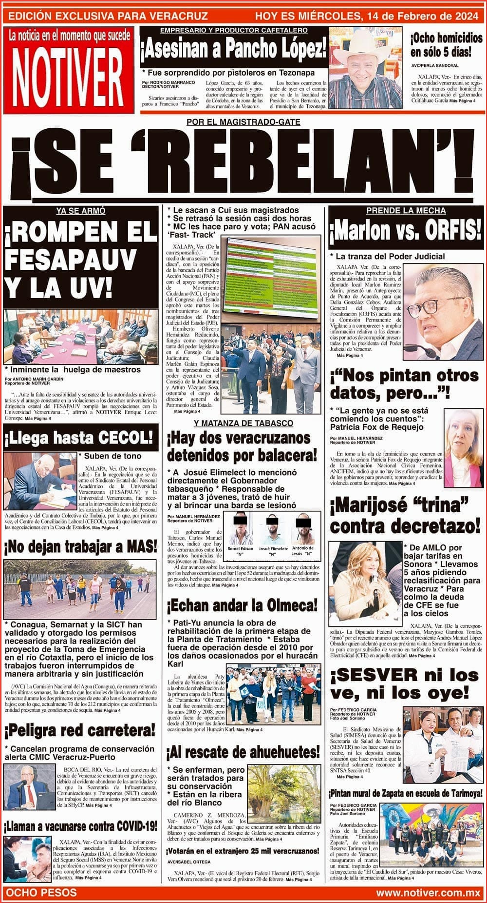 PRIMERA LA PORTADA - MIÉRCOLES 14 DE FEBRERO 2024 POR EL MAGISTRADO-GATE - * LE SACAN A CUI SUS MAGISTRADOS * SE RETRASÓ LA SESIÓN CASI DOS HORAS * MC LES HACE PARO Y VOTA; PAN ACUSÓ ‘FAST- TRACK’ 14 febrero 2024 Y LOS ANUNCIOS...Cotice su Anuncio Su Correo Electrónico: Texto: Enviar