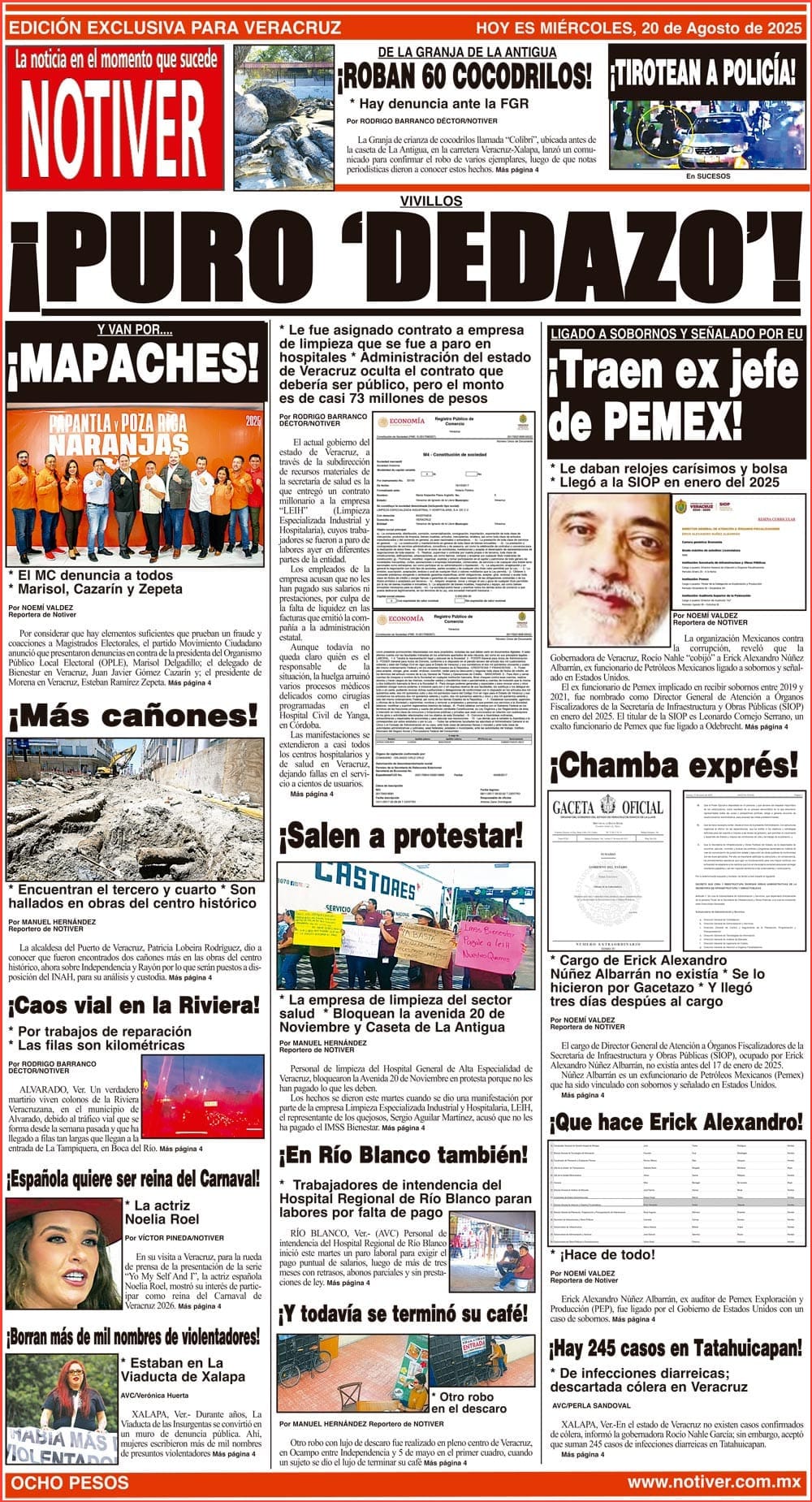 PRIMERA LA PORTADA - MIÉRCOLES 20 DE AGOSTO 2025 VIVILLOS - *LE FUE ASIGNADO CONTRATO A EMPRESA DE LIMPIEZA QUE SE FUE A PARO EN HOSPITALES *ADMINISTRACIÓN DEL ESTADO DE VERACRUZ OCULTA EL CONTRATO QUE DEBERÍA SER PÚBLICO, PERO EL MONTO ES DE CASI 73 MILLONES DE PESOS 20 agosto 2025