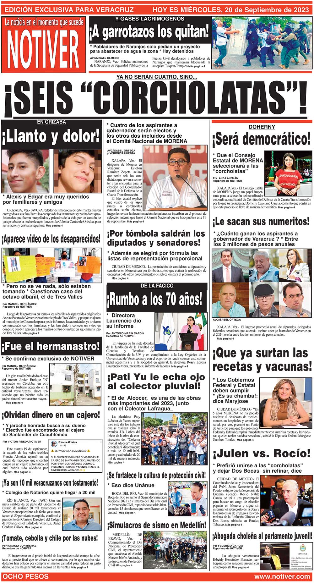 PRIMERA LA PORTADA - MIÉRCOLES, 20 DE SEPTIEMBRE 2023 YA NO SERÁN CUATRO, SINO... - * CUATRO DE LOS ASPIRANTES A GOBERNADOR SERÁN ELECTOS Y LOS OTROS DOS INCLUÍDOS DESDE EL COMITÉ NACIONAL DE MORENA 20 septiembre 2023 Y LOS ANUNCIOS...