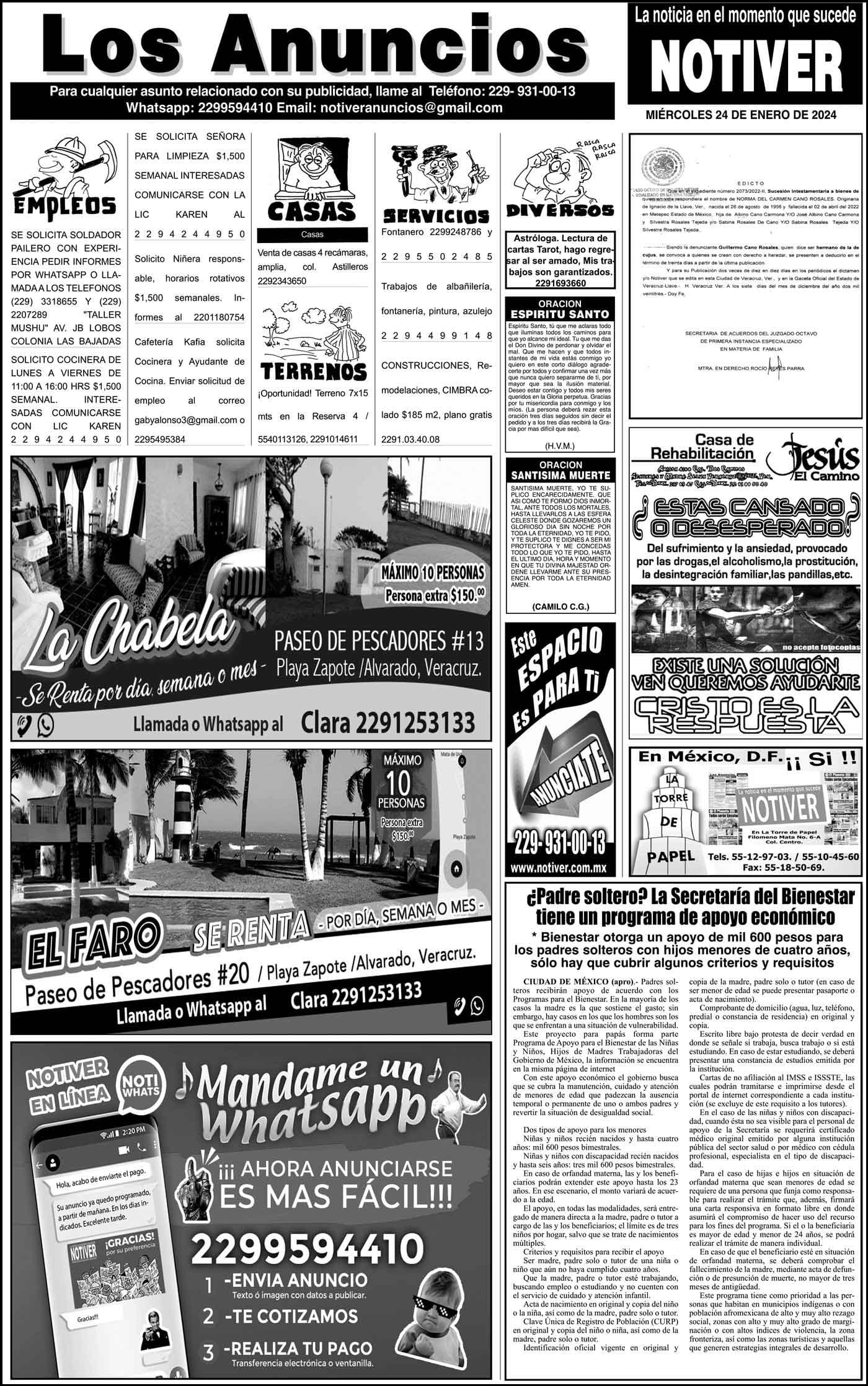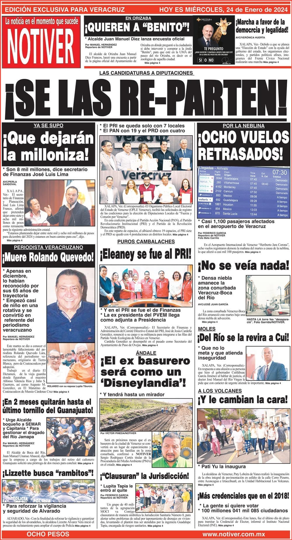 PRIMERA LA PORTADA - MIÉRCOLES 24 DE ENERO 2024 LAS CANDIDATURAS A DIPUTACIONES - * EL PRI SE QUEDA SOLO CON 7 LOCALES * EL PAN CON 19 Y EL PRD CON CUATRO 24 enero 2024 Y LOS ANUNCIOS...Cotice su Anuncio Su Correo Electrónico: Texto: Enviar