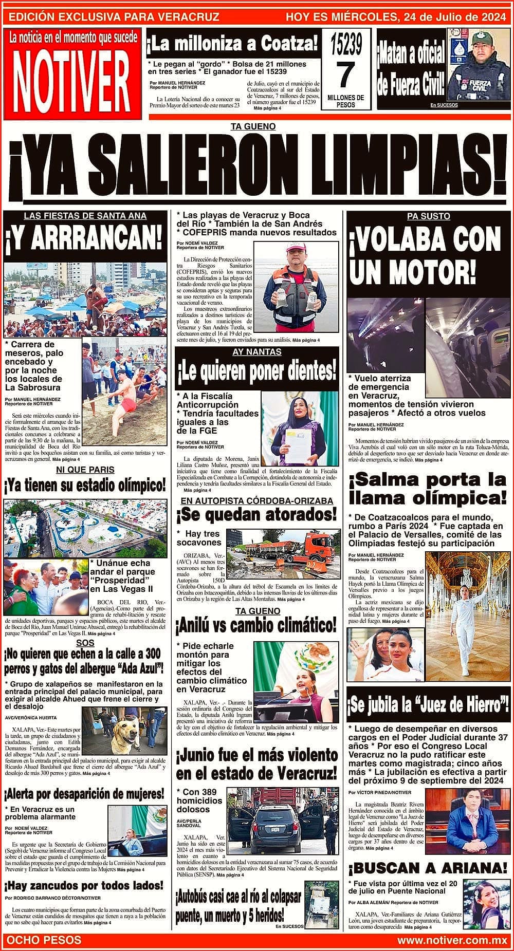 PRIMERA LA PORTADA - MIÉRCOLES 24 DE JULIO 2024 TA GUENO - * LAS PLAYAS DE VERACRUZ Y BOCA DEL RÍO * TAMBIÉN LA DE SAN ANDRÉS * COFEPRIS MANDA NUEVOS RESULTADOS 24 julio 2024