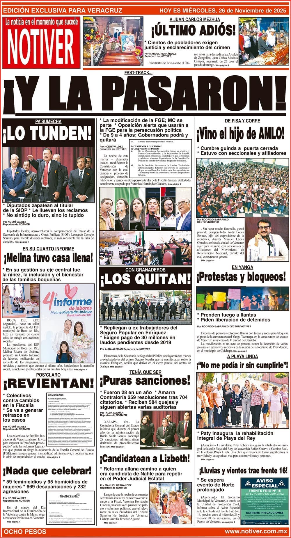 PRIMERA LA PORTADA - MIÉRCOLES 26 DE NOVIEMBRE 2025 FAST-TRACK... - *LA MODIFICACIÓN DE LA FGE; MC SE PARTE *OPOSICIÓN ALERTA QUE USARÁN A LA FGE PARA LA PERSECUCIÓN POLÍTICA *DE 9 A 4 AÑOS; GOBERNADORA PODRÁ Y QUITARÁ 26 noviembre 2025