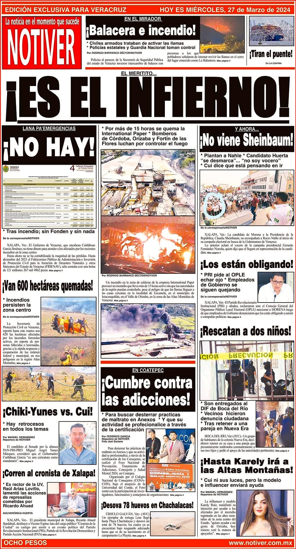 PRIMERA LA PORTADA - MIÉRCOLES 27 DE MARZO 2024 EL MERITITO... - * POR MÁS DE 15 HORAS SE QUEMA LA INTERNATIONAL PAPER * BOMBEROS DE CÓRDOBA, ORIZABA Y FORTÍN DE LAS FLORES LUCHAN POR CONTROLAR EL FUEGO 27 marzo 2024 Y LOS ANUNCIOS...Cotice su Anuncio Su Correo Electrónico: Texto: Enviar