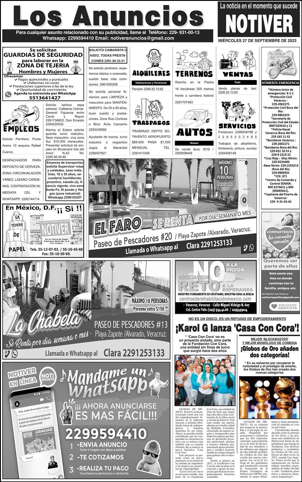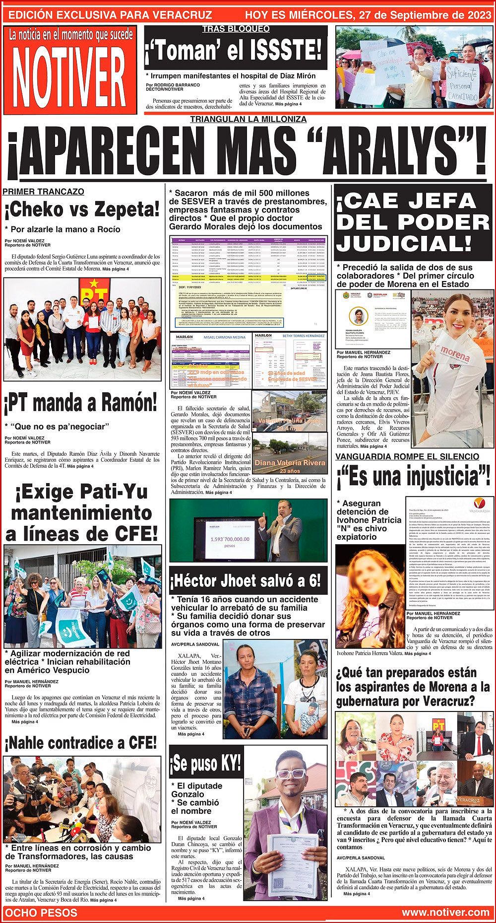 PRIMERA LA PORTADA - MIÉRCOLES, 27 DE SEPTIEMBRE 2023 TRIANGULAN LA MILLONIZA - * SACARON MÁS DE MIL 500 MILLONES DE SESVER A TRAVÉS DE PRESTANOMBRES, EMPRESAS FANTASMAS Y CONTRATOS DIRECTOS * QUE EL PROPIO DOCTOR GERARDO MORALES DEJÓ LOS DOCUMENTOS 27 septiembre 2023 Y LOS ANUNCIOS...Cotice su Anuncio Su Correo Electrónico: Texto: Enviar