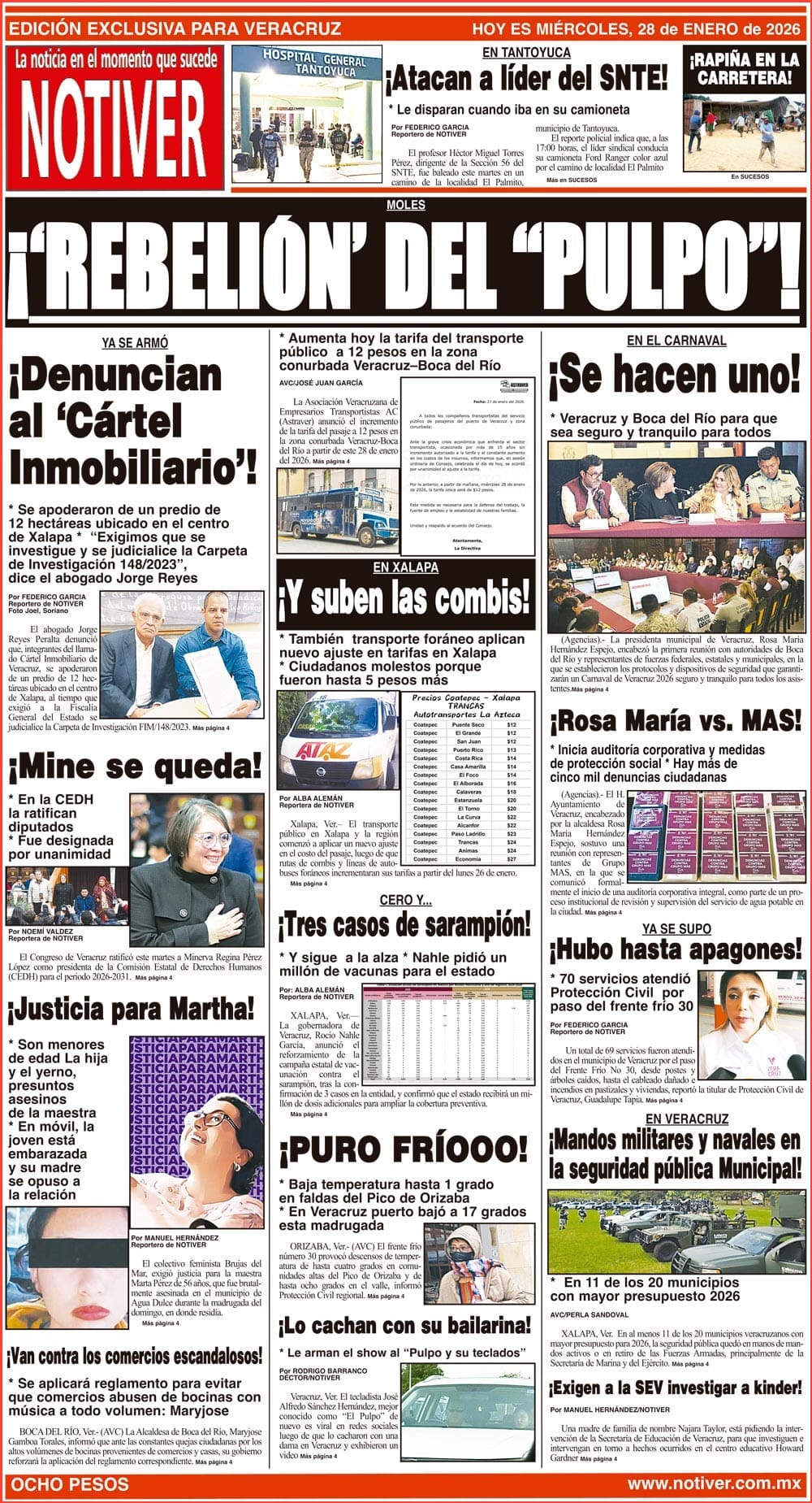 PRIMERA LA PORTADA - MIÉRCOLES 28 DE ENERO 2026 MOLES - *AUMENTA HOY LA TARIFA DEL TRANSPORTE PÚBLICO A 12 PESOS EN LA ZONA CONURBADA VERACRUZ–BOCA DEL RÍO 28 enero 2026