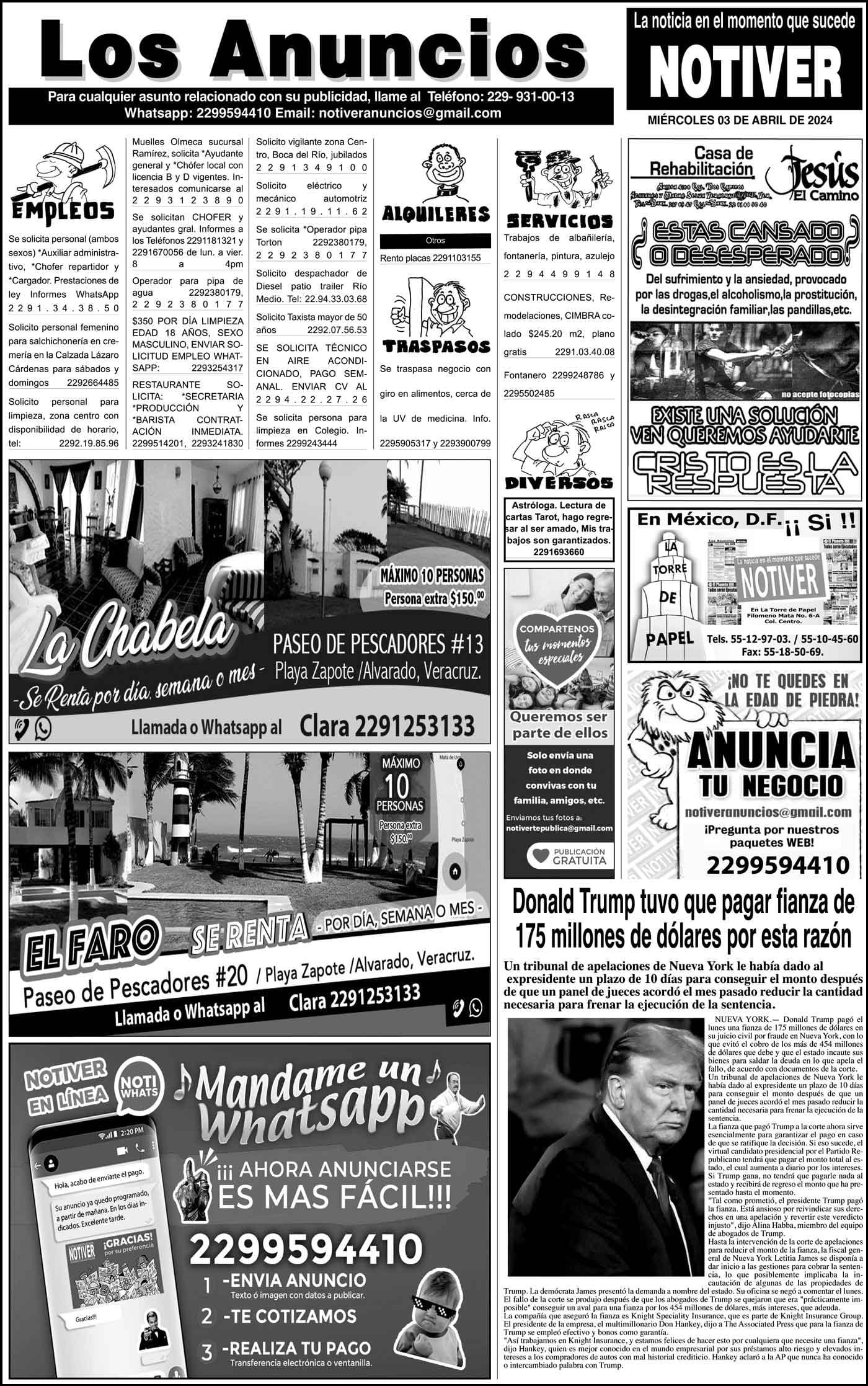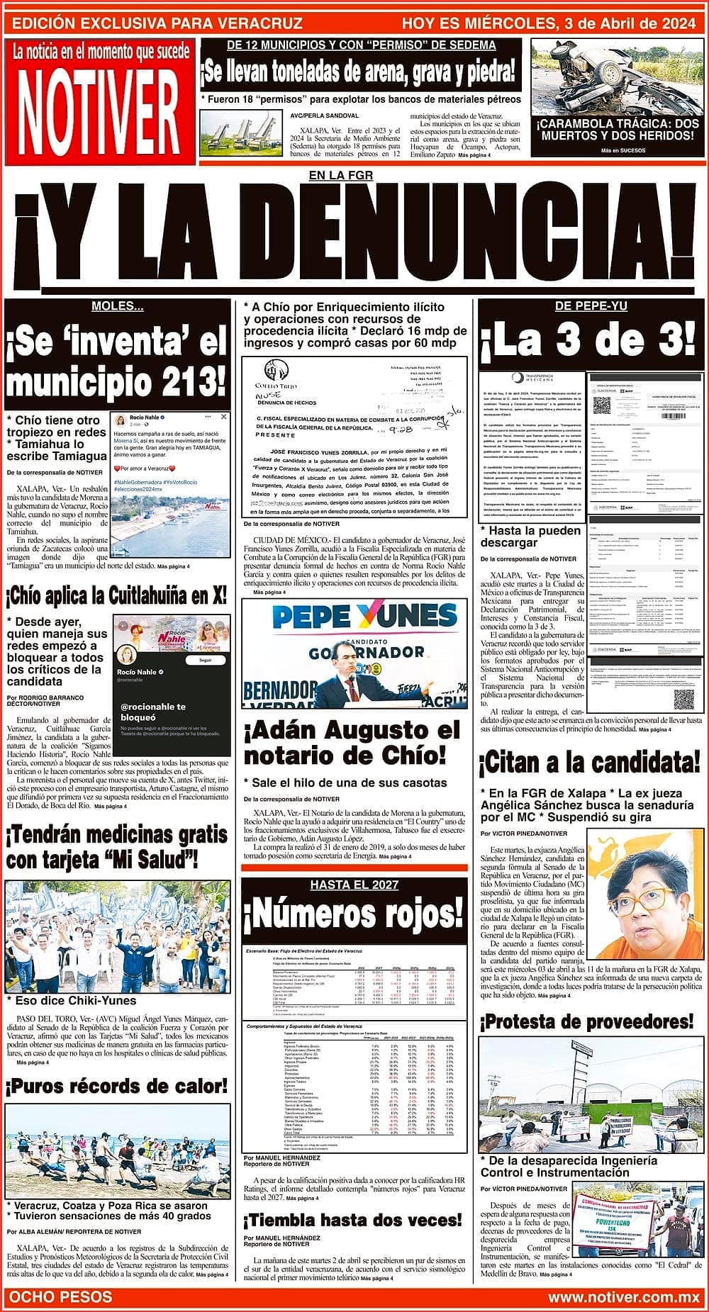 PRIMERA LA PORTADA - MIÉRCOLES 3 DE ABRIL 2024 EN LA FGR - * A CHÍO POR ENRIQUECIMIENTO ILÍCITO Y OPERACIONES CON RECURSOS DE PROCEDENCIA ILÍCITA *DECLARÓ 16 MDP DE INGRESOS Y COMPRÓ CASAS POR 60 MDP 3 abril 2024 Y LOS ANUNCIOS...Cotice su Anuncio Su Correo Electrónico: Texto: Enviar