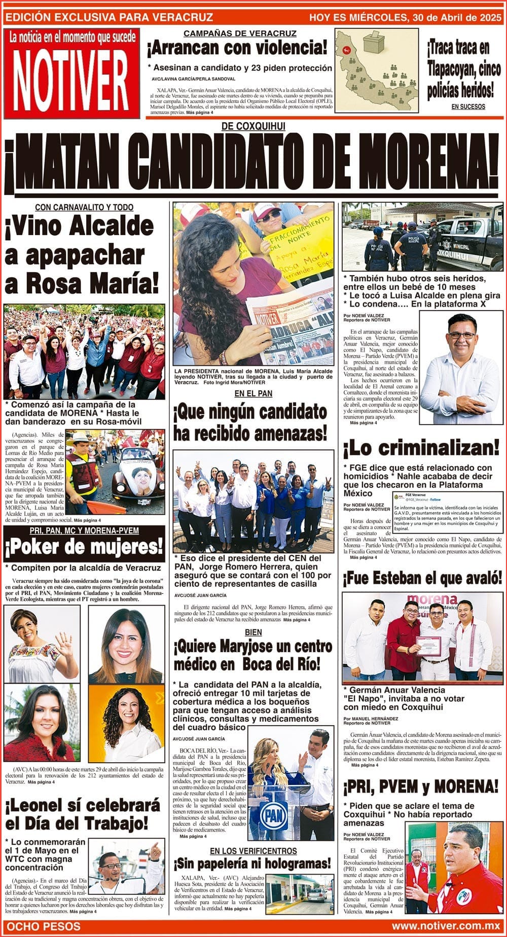 PRIMERA LA PORTADA - MIÉRCOLES 30 DE ABRIL 2025 DE COXQUIHUI - *TAMBIÉN HUBO OTROS SEIS HERIDOS, ENTRE ELLOS UN BEBÉ DE 10 MESES *LE TOCÓ A LUISA ALCALDE EN PLENA GIRA *LO CONDENA…. EN LA PLATAFORMA X 30 abril 2025