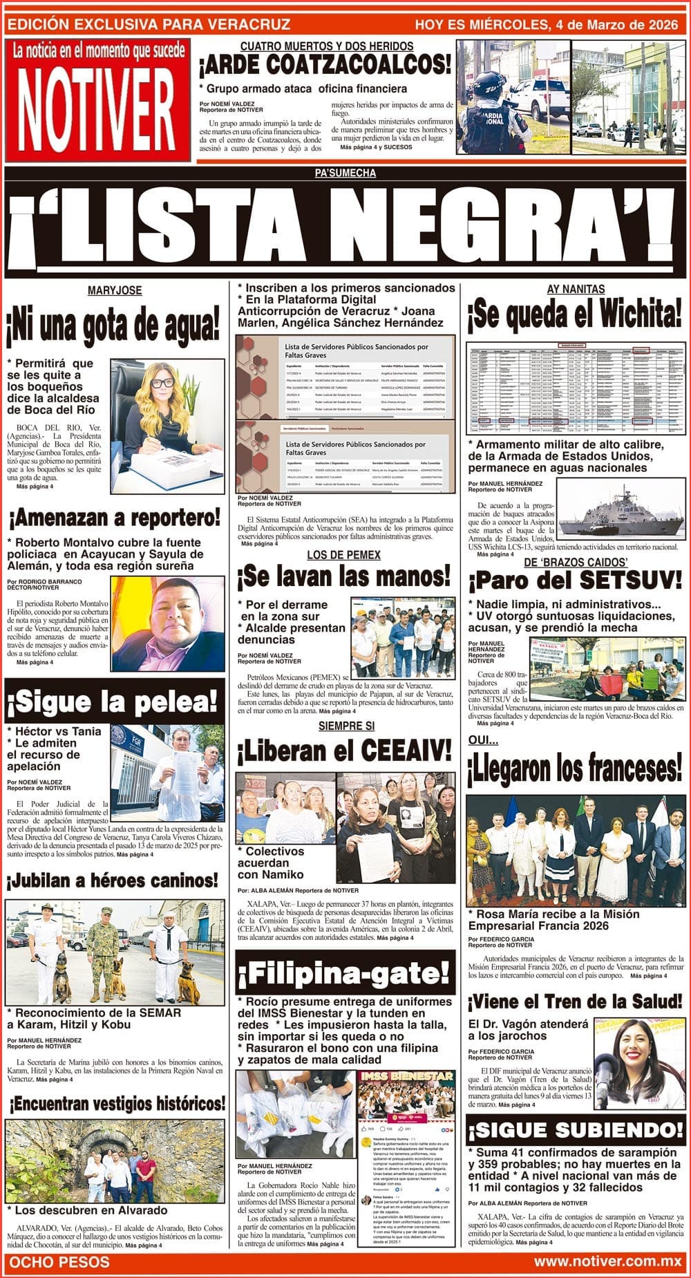 PRIMERA LA PORTADA - MIÉRCOLES 4 DE MARZO PA’SUMECHA - *INSCRIBEN A LOS PRIMEROS SANCIONADOS *EN LA PLATAFORMA DIGITAL ANTICORRUPCIÓN DE VERACRUZ *JOANA MARLEN, ANGÉLICA SÁNCHEZ HERNÁNDEZ 4 marzo 2026