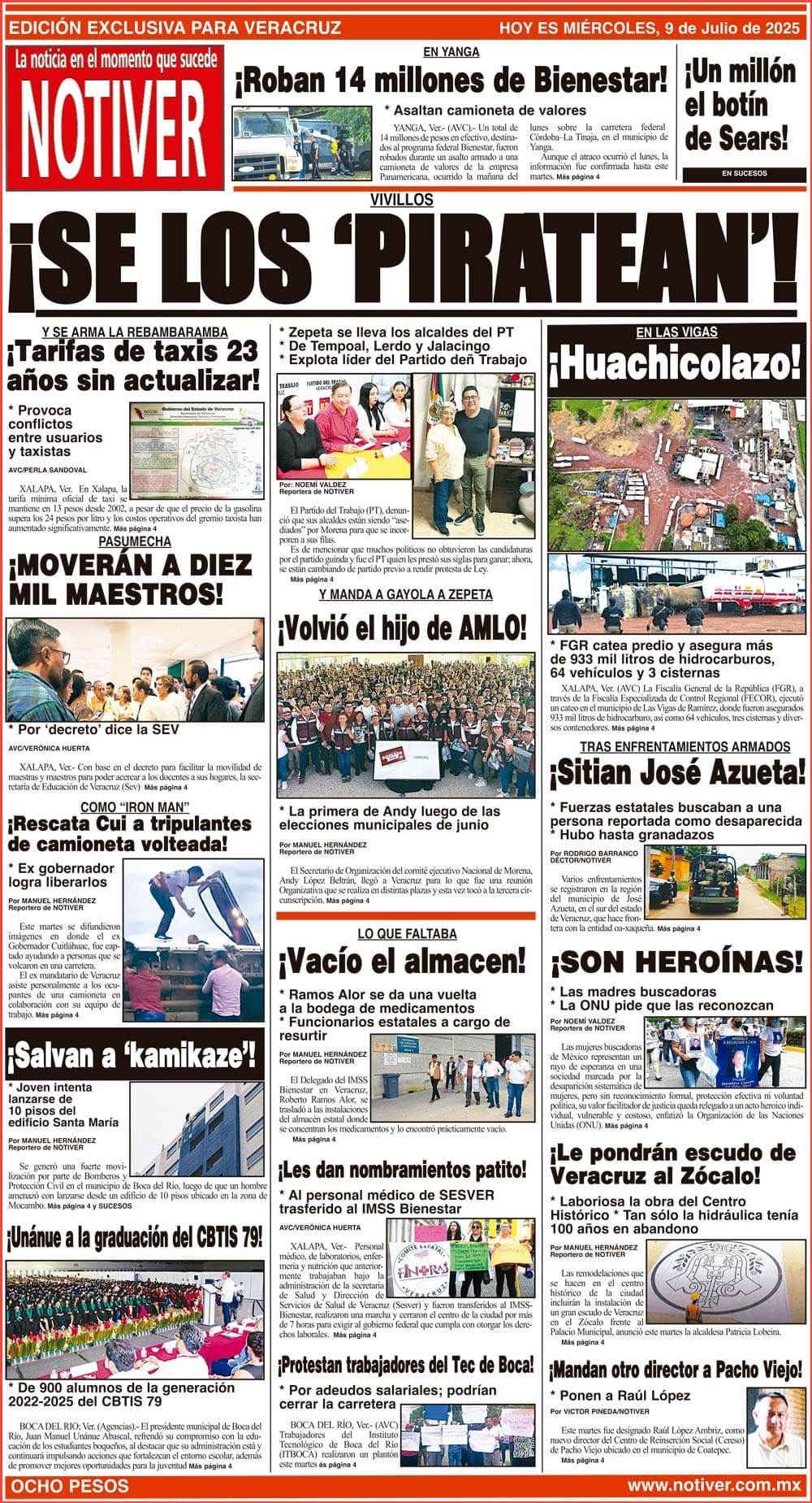 PRIMERA LA PORTADA - MIÉRCOLES 9 DE JULIO 2025 VIVILLOS - *ZEPETA SE LLEVA LOS ALCALDES DEL PT *DE TEMPOAL, LERDO Y JALACINGO *EXPLOTA LÍDER DEL PARTIDO DEÑ TRABAJO 9 julio 2025