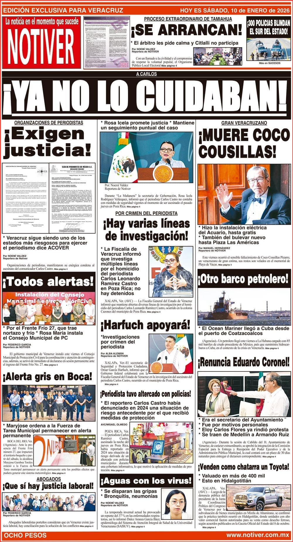 PRIMERA LA PORTADA - SÁBADO 10 DE ENERO 2026 A CARLOS - *ROSA ICELA PROMETE JUSTICIA *MANTIENE UN SEGUIMIENTO PUNTUAL DEL CASO 10 enero 2026