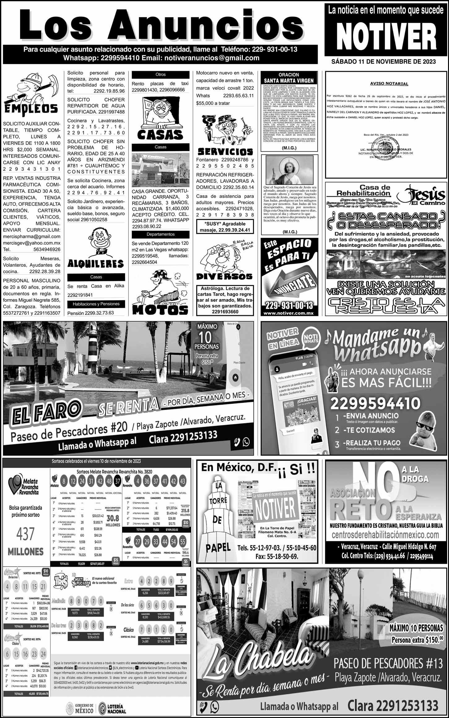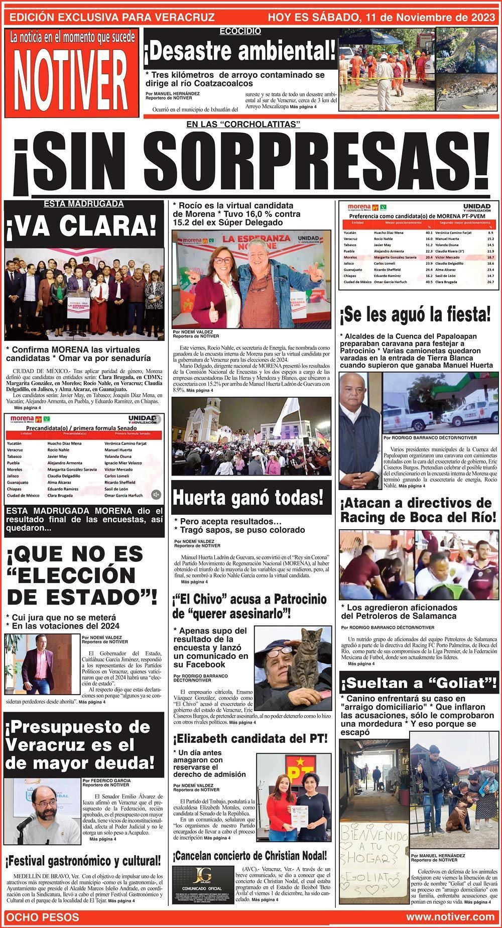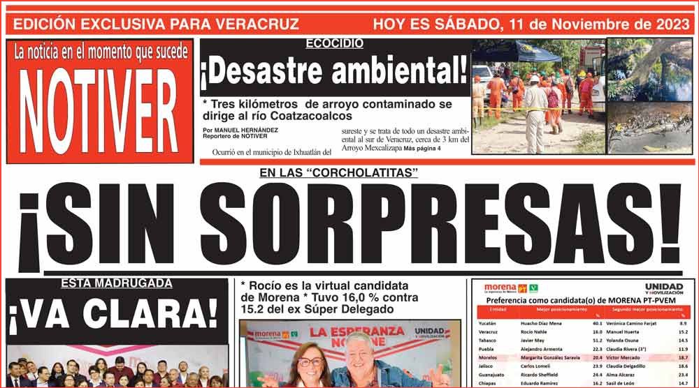 PRIMERA LA PORTADA - SÁBADO, 11 DE NOVIEMBRE 2023 EN LAS “CORCHOLATITAS” - * ROCÍO ES LA VIRTUAL CANDIDATA DE MORENA * TUVO 16,0 % CONTRA 15.2 DEL EX SÚPER DELEGADO 11 noviembre 2023 Y LOS ANUNCIOS...Cotice su Anuncio Su Correo Electrónico: Texto: Enviar