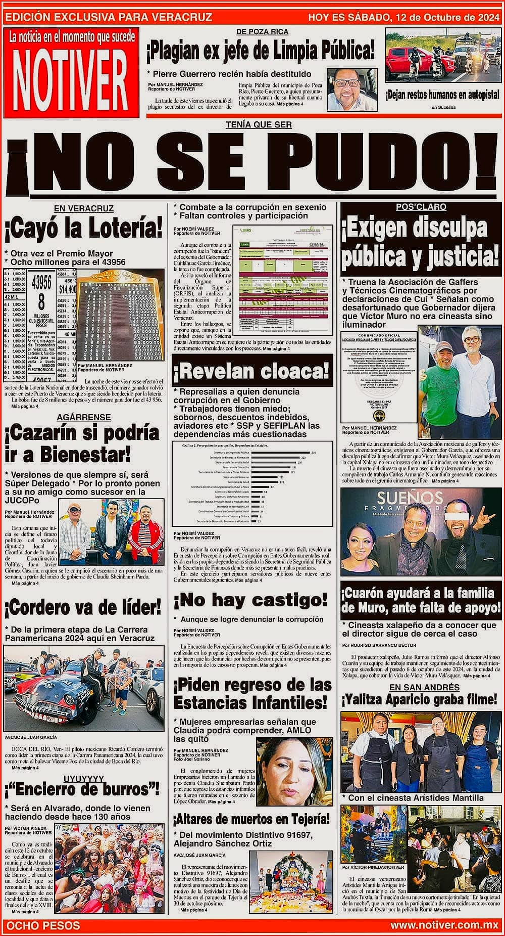 PRIMERA LA PORTADA - SÁBADO 12 DE OCTUBRE 2024 TENÍA QUE SER - *COMBATE A LA CORRUPCIÓN EN SEXENIO *FALTAN CONTROLES Y PARTICIPACIÓN 12 octubre 2024