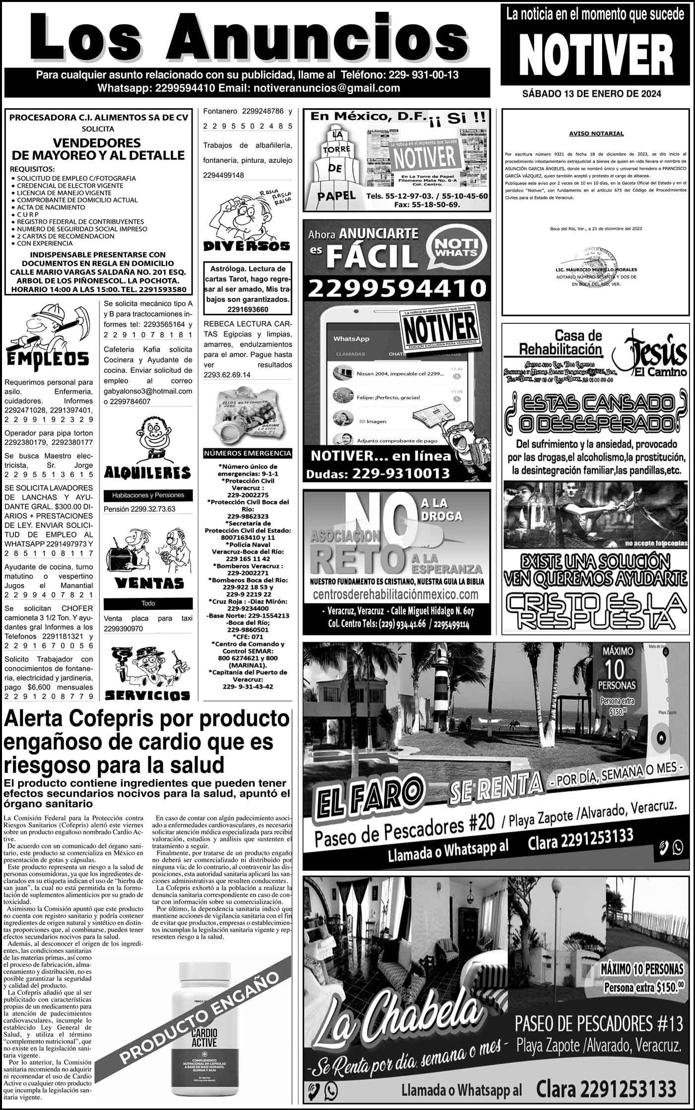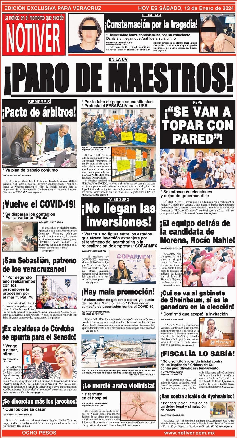 PRIMERA LA PORTADA - SÁBADO 13 DE ENERO 2024 EN LA UV - * POR LA FALTA DE PAGOS SE MANIFIESTAN * PROTESTA EL FESAPAUV EN LA USBI 13 enero 2024 Y LOS ANUNCIOS...Cotice su Anuncio Su Correo Electrónico: Texto: Enviar
