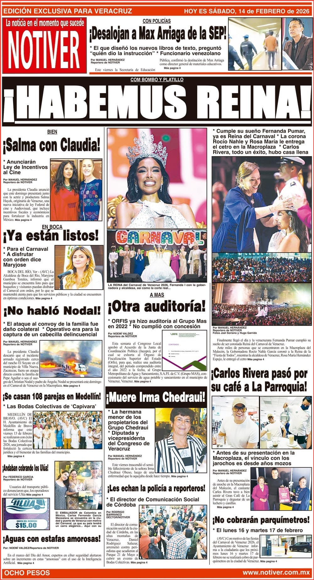 PRIMERA LA PORTADA - SÁBADO 14 DE FEBRERO 2026 COM BOMBO Y PLATILLO - *CUMPLE SU SUEÑO FERNANDA PUMAR, YA ES REINA DEL CARNAVAL *LA CORONA ROCÍO NAHLE Y ROSA MARÍA LE ENTREGA EL CETRO EN LA MACROPLAZA *CARLOS RIVERA, TODO UN ÉXITO, HUBO CASA LLENA 14 febrero 2026