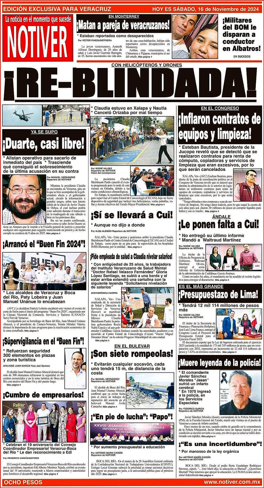 PRIMERA LA PORTADA - SÁBADO 16 DE NOVIEMBRE 2024 CON HELICÓPTEROS Y DRONES - * CLAUDIA ESTUVO EN XALAPA Y NAUTLA * CANCELÓ ORIZABA POR MAL TIEMPO 16 noviembre 2024