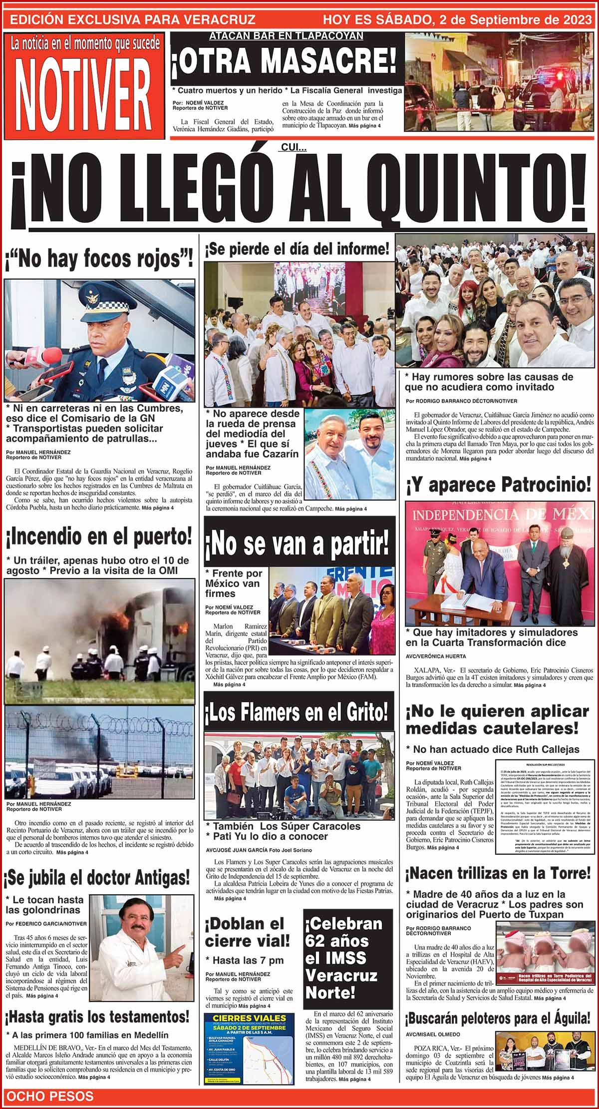 PRIMERA LA PORTADA - SÁBADO, 2 DE SEPTIEMBRE 2023 * HAY RUMORES SOBRE LAS CAUSAS DE QUE NO ACUDIERA COMO INVITADO 2 septiembre 2023 Y LOS ANUNCIOS... Cotice su Anuncio Su Correo Electrónico: Texto: Enviar Más Noticias ¡SOS EN ARROYO MORENO! - SE HACE CHIQUITO ¡“LO VAMOS A EXTRAÑAR”! - *“Yo y mis hijos”, lamenta la ex alcaldesa Paty Lobeira ¡NACE COALICIÓN DE MANIOBRISTAS! - *Con auténticos socios accionistas ¡DETIENEN A FAMILIARES DE REVERIANO PÉREZ! - EL EX ALCALDE DE COXQUIHUI ¡CLAUDIA DICE NO! - AL ALZA DEL COSTO DE LA TORTILLA NOTI-MEME | - HOMENAJE A PEDRITO! ¡MAÑANITAS A NAHLE! - LLEGÓ A 62 AÑOS, BIEN VIVIDOS ¡REVIENTAN ABOGADOS! - POR CATEOS DISFRAZADOS ¡BLOQUEO DE EX POLICÍAS! - *Exigen pagos pendientes desde 2015 LA ENCUESTA | - ASFALTARÁN CON GOTITAS!