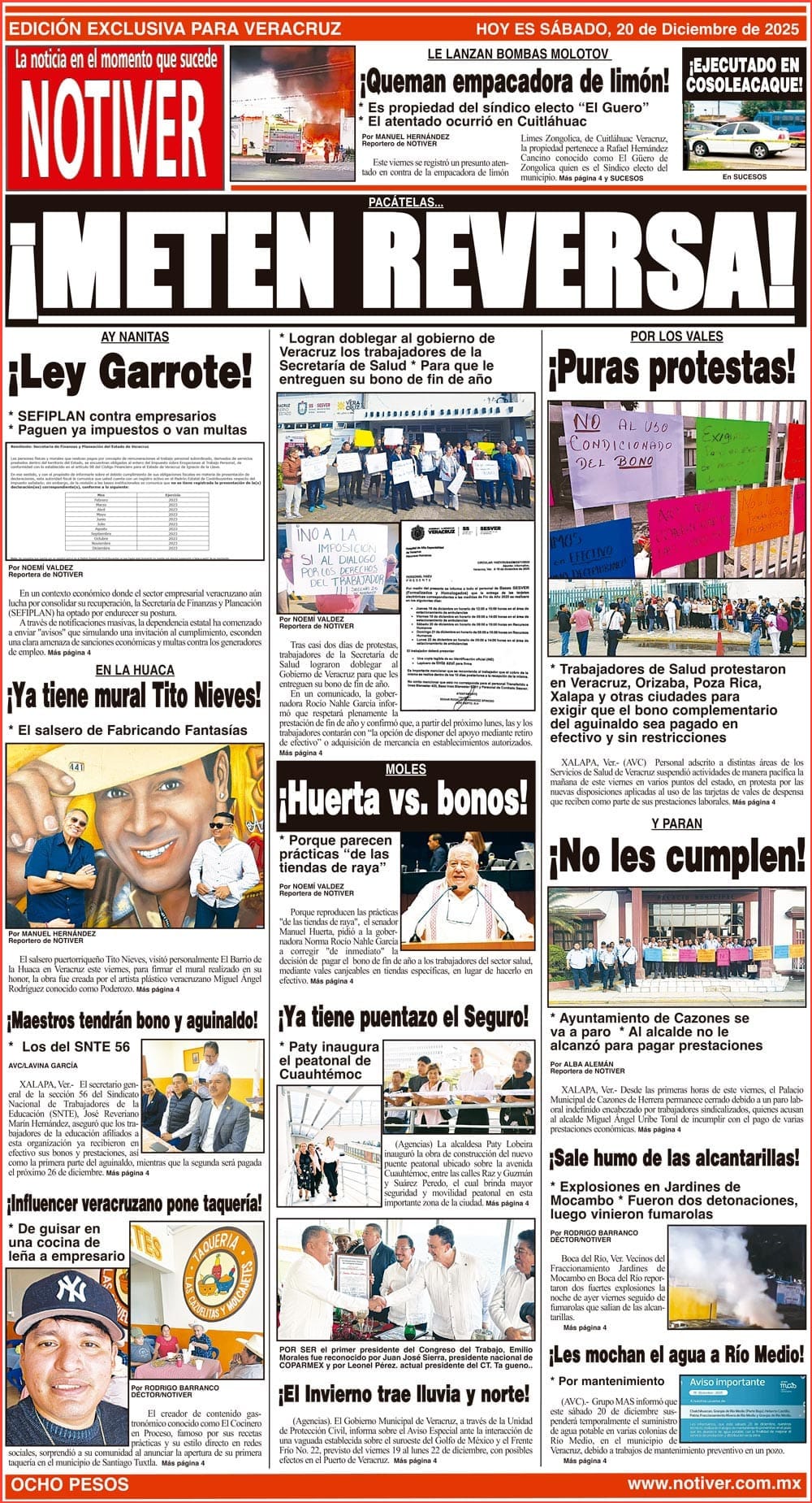 PRIMERA LA PORTADA - SÁBADO 20 DE DICIEMBRE 2025 PACÁTELAS... - *LOGRAN DOBLEGAR AL GOBIERNO DE VERACRUZ LOS TRABAJADORES DE LA SECRETARÍA DE SALUD *PARA QUE LE ENTREGUEN SU BONO DE FIN DE AÑO 20 diciembre 2025