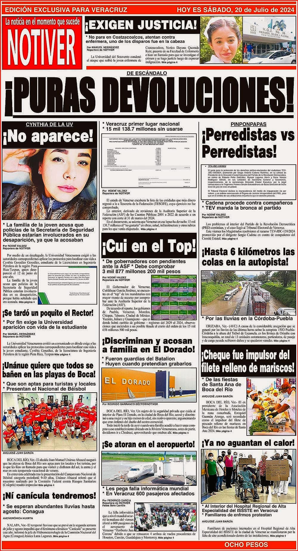 PRIMERA LA PORTADA - SÁBADO 20 DE JULIO 2024 DE ESCÁNDALO - * VERACRUZ PRIMER LUGAR NACIONAL * 15 MIL 138.7 MILLONES SIN USARSE 20 julio 2024