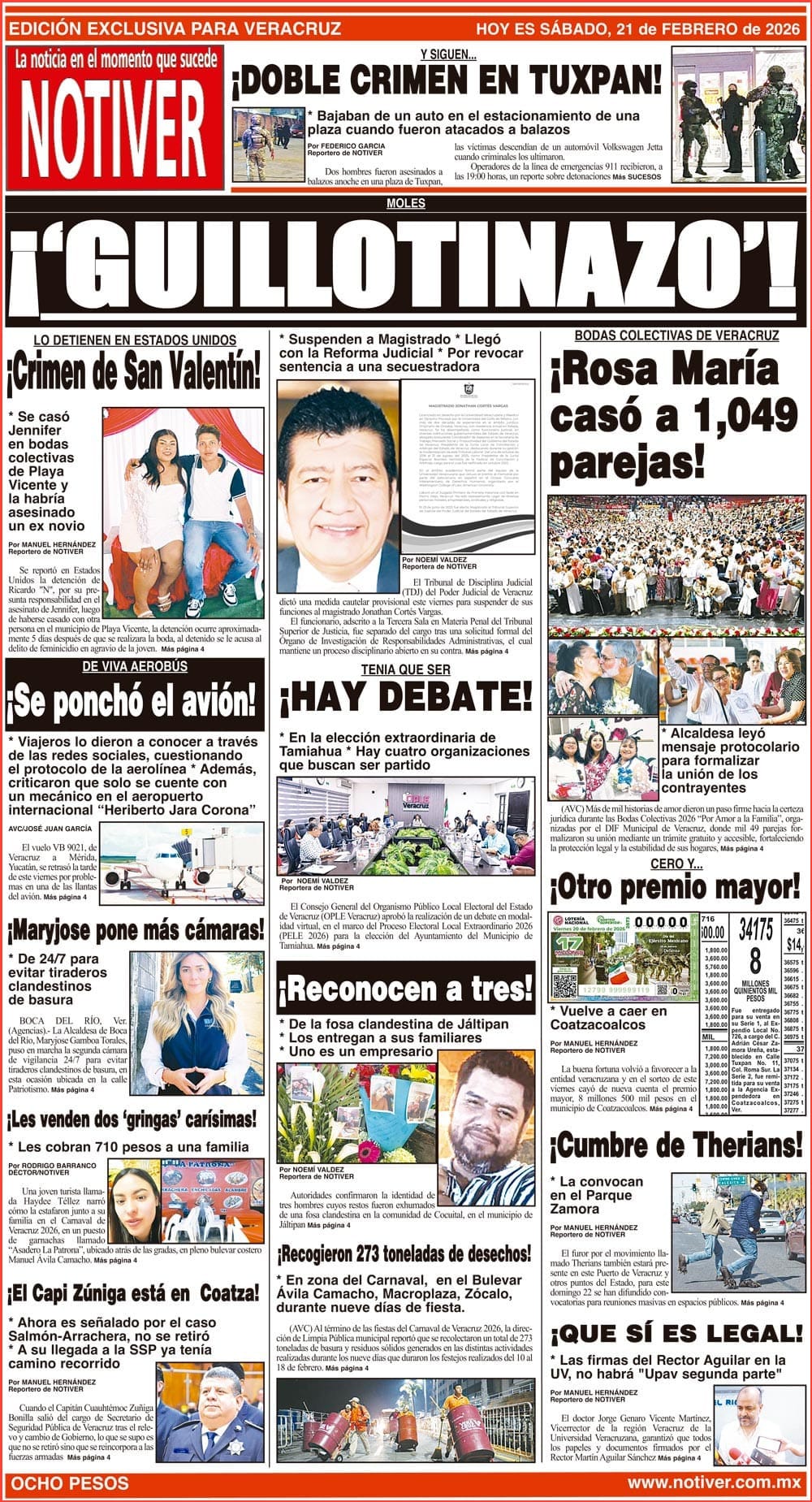 PRIMERA LA PORTADA - SÁBADO 21 DE FEBRERO 2026 MOLES - *SUSPENDEN A MAGISTRADO *LLEGÓ CON LA REFORMA JUDICIAL *POR REVOCAR SENTENCIA A UNA SECUESTRADORA 21 febrero 2026