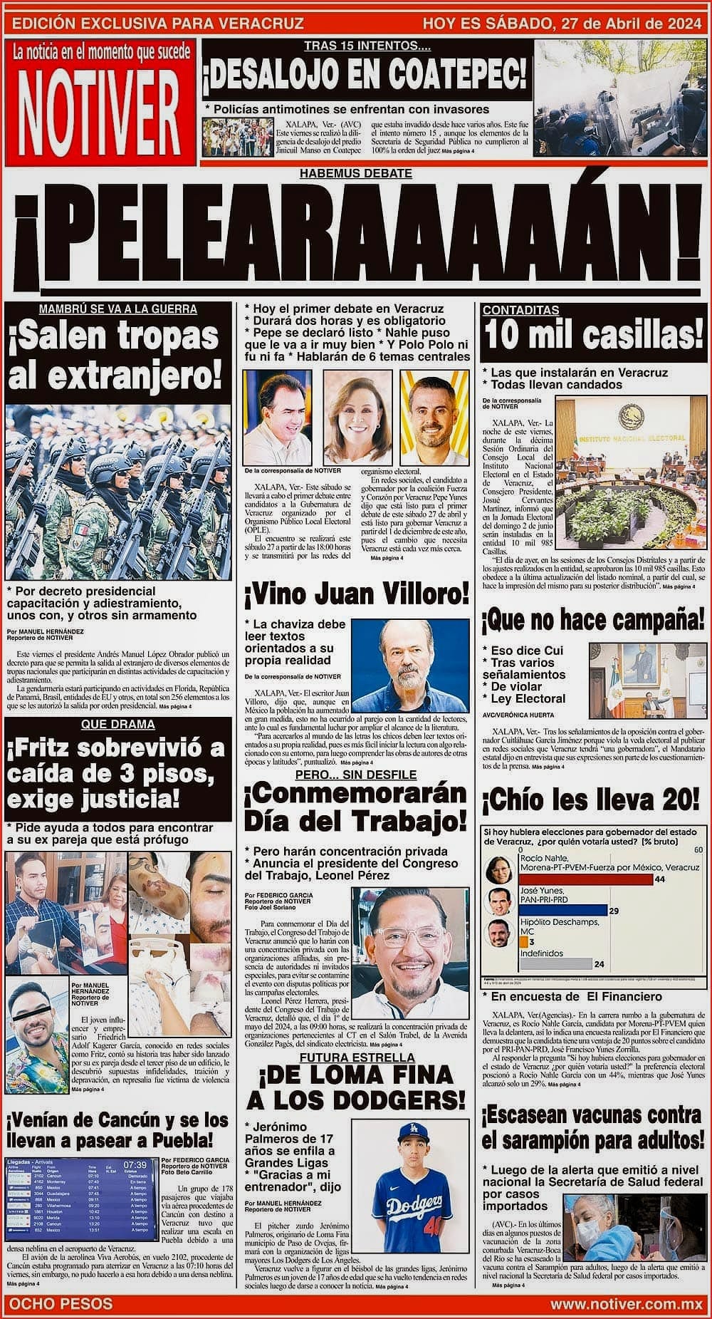 PRIMERA LA PORTADA - SÁBADO 27 DE ABRIL 2024 HABEMUS DEBATE - *HOY EL PRIMER DEBATE EN VERACRUZ *DURARÁ DOS HORAS Y ES OBLIGATORIO *PEPE SE DECLARÓ LISTO *NAHLE PUSO QUE LE VA A IR MUY BIEN *Y POLO POLO NI FU NI FA *HABLARÁN DE 6 TEMAS CENTRALES 27 abril 2024 Y LOS ANUNCIOS...