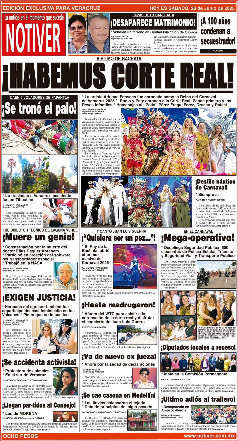 PRIMERA LA PORTADA - SÁBADO 28 DE JUNIO 2025 A RITMO DE BACHATA - * LA ARTISTA ADRIANA FONSECA FUE CORONADA COMO LA REINA DEL CARNAVAL DE VERACRUZ 2025 * ROCÍO Y PATY CORONAN A LA CORTE REAL, PANDA PRIMERO Y LOS REYES INFANTILES * HOMENAJES AL “POLLO” PÉREZ FRAGA, FEREZ, DRUSSO Y RAFAEL 28 junio 2025