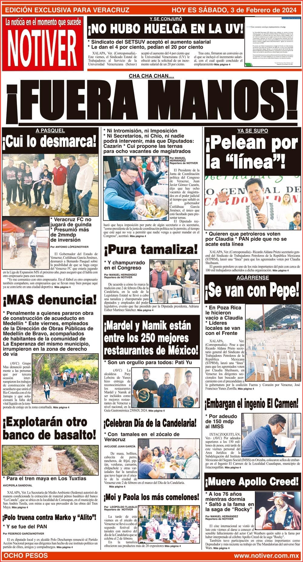 PRIMERA LA PORTADA - SÁBADO 3 DE FEBRERO 2024 CHA CHA CHAN.... - * NI INTROMISIÓN, NI IMPOSICIÓN * NI SECRETARIOS, NI CHÍO, NI NADIE PODRÁ INTERVENIR, MÁS QUE DIPUTADOS: CAZARIN * CUI PROPONE LAS TERNAS PARA OCHO VACANTES DE MAGISTRADOS 3 febrero 2024 Y LOS ANUNCIOS...Cotice su Anuncio Su Correo Electrónico: Texto: Enviar