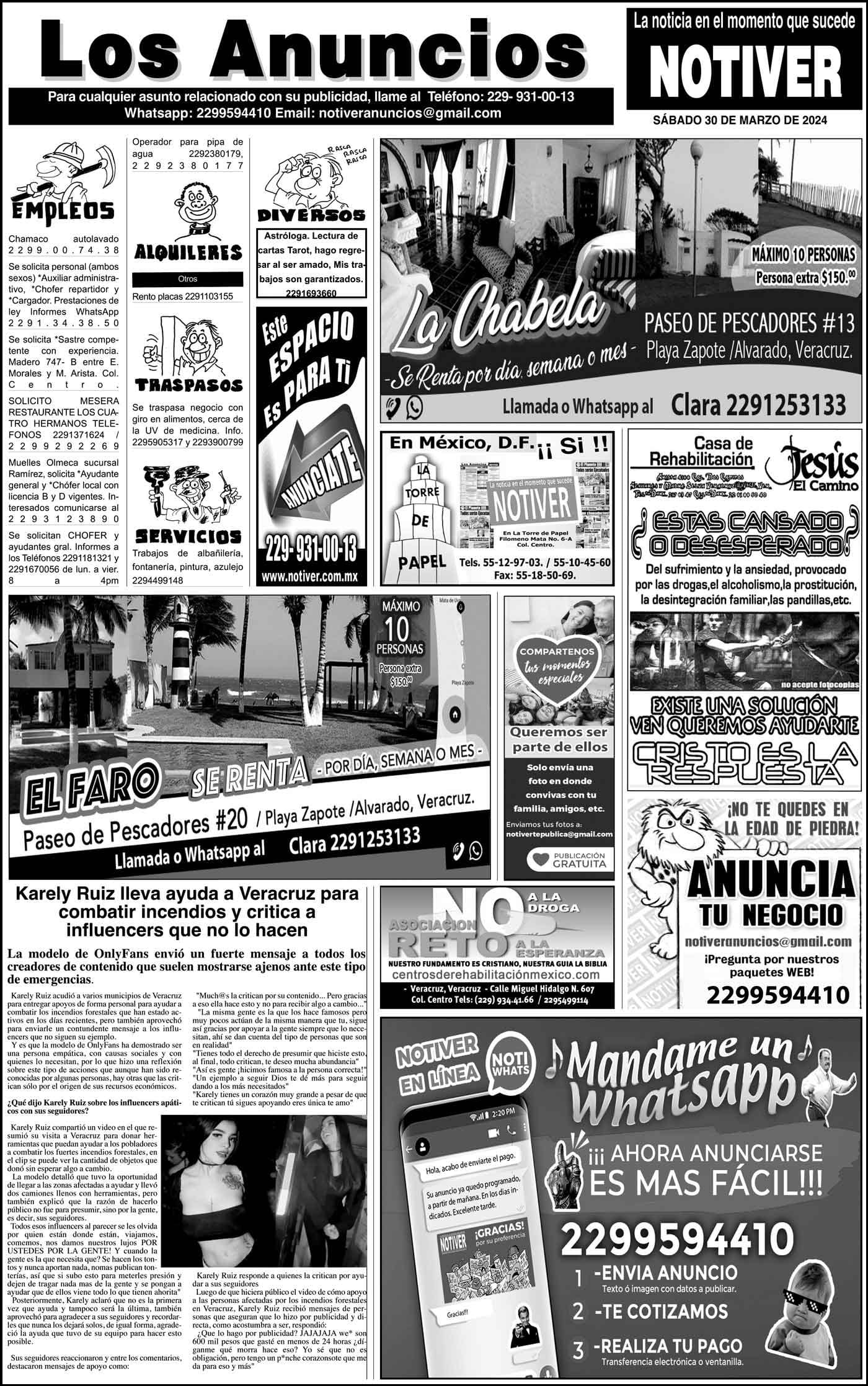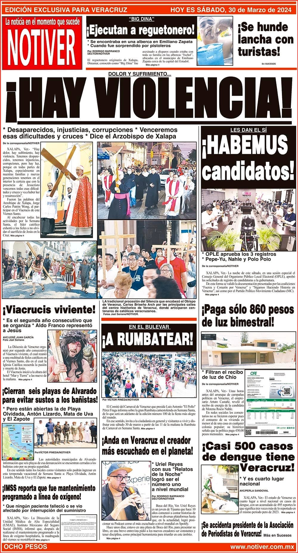 PRIMERA LA PORTADA - SÁBADO 30 DE MARZO 2024 DOLOR Y SUFRIMIENTO... - * DESAPARECIDOS, INJUSTICIAS, CORRUPCIONES * VENCEREMOS ESAS DIFICULTADES Y CRUCES * DICE EL ARZOBISPO DE XALAPA 30 marzo 2024 Y LOS ANUNCIOS...Cotice su Anuncio Su Correo Electrónico: Texto: Enviar