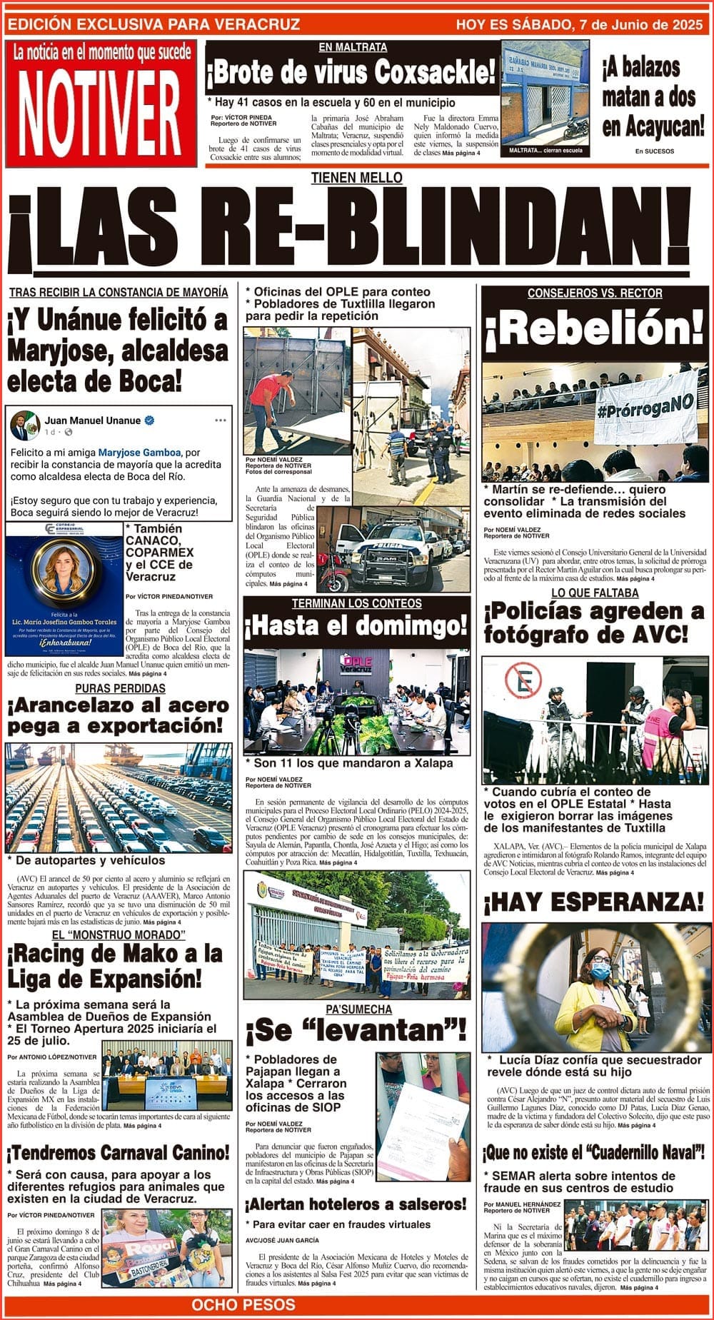 PRIMERA LA PORTADA - SÁBADO 7 DE JUNIO 2025 TIENEN MELLO - * OFICINAS DEL OPLE PARA CONTEO * POBLADORES DE TUXTLILLA LLEGARON PARA PEDIR LA REPETICIÓN 7 junio 2025