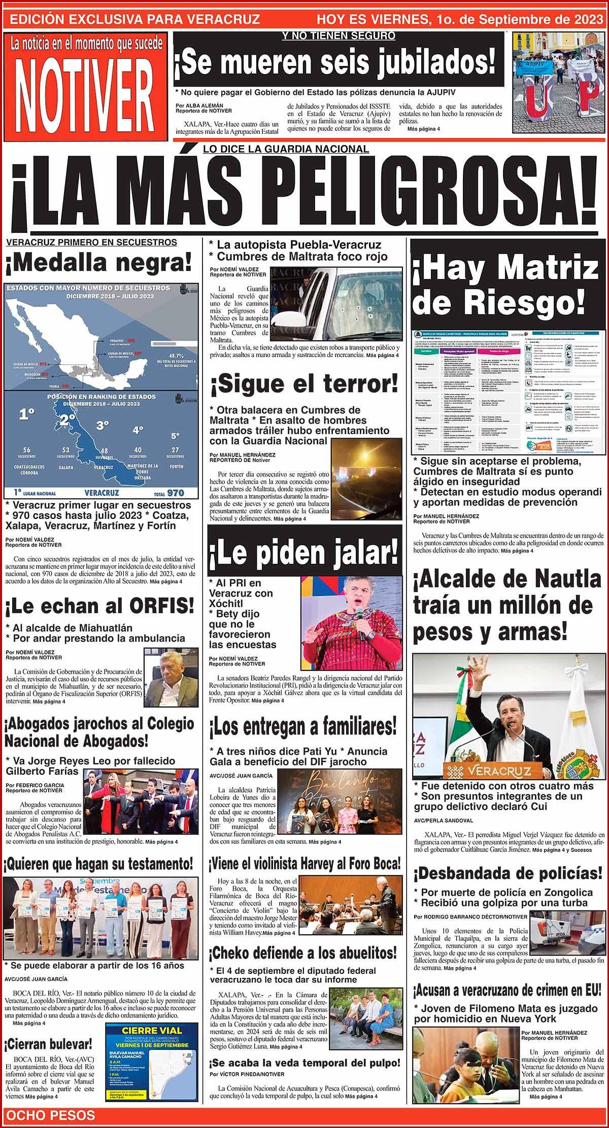 PRIMERA LA PORTADA - VIERNES, 1 DE SEPTIEMBRE 2023 LO DICE LA GUARDIA NACIONAL - * LA AUTOPISTA PUEBLA-VERACRUZ * CUMBRES DE MALTRATA FOCO ROJO 1 septiembre 2023 Y LOS ANUNCIOS... Cotice su Anuncio Su Correo Electrónico: Texto: Enviar Más Noticias ¡BUSCAN SÚPER AGENTES! - EN BOCA ¡LE METEN LA DOLARIZA! - *A la modernización de Hutchinson LA ENCUESTA | - PONDRÁN LONAS DEL BIENESTAR! ¡AUMENTAN JAULAZOS EN GEO LOS PINOS! LOS CARTONES ¡MIL MILLONES DE DÓLARES! - PA’CONSTELLATION ¡MATAN A LAS ABEJAS! - CON FERTILIZANTES ¡LO RE-UTILIZARÁN! - EL CHAPOPOTE DE LAS PLAYAS ¡FUERON 9 AHOGADOS! - TRAS OPERATIVO SEMANA SANTA ESTATAL ¡EXIGEN QUE LE PAGUEN! - *Denuncia a aseguradora ya que solo quieren darle seis mil pesos