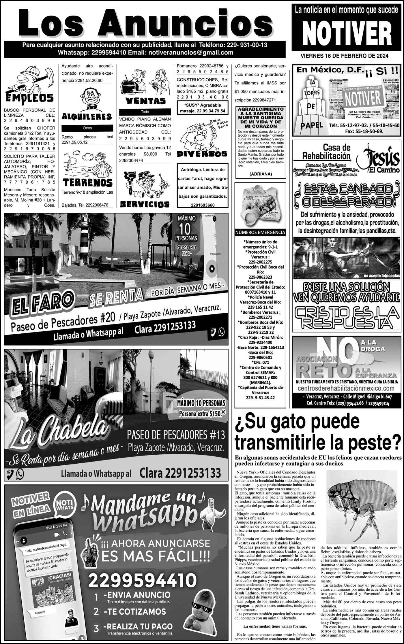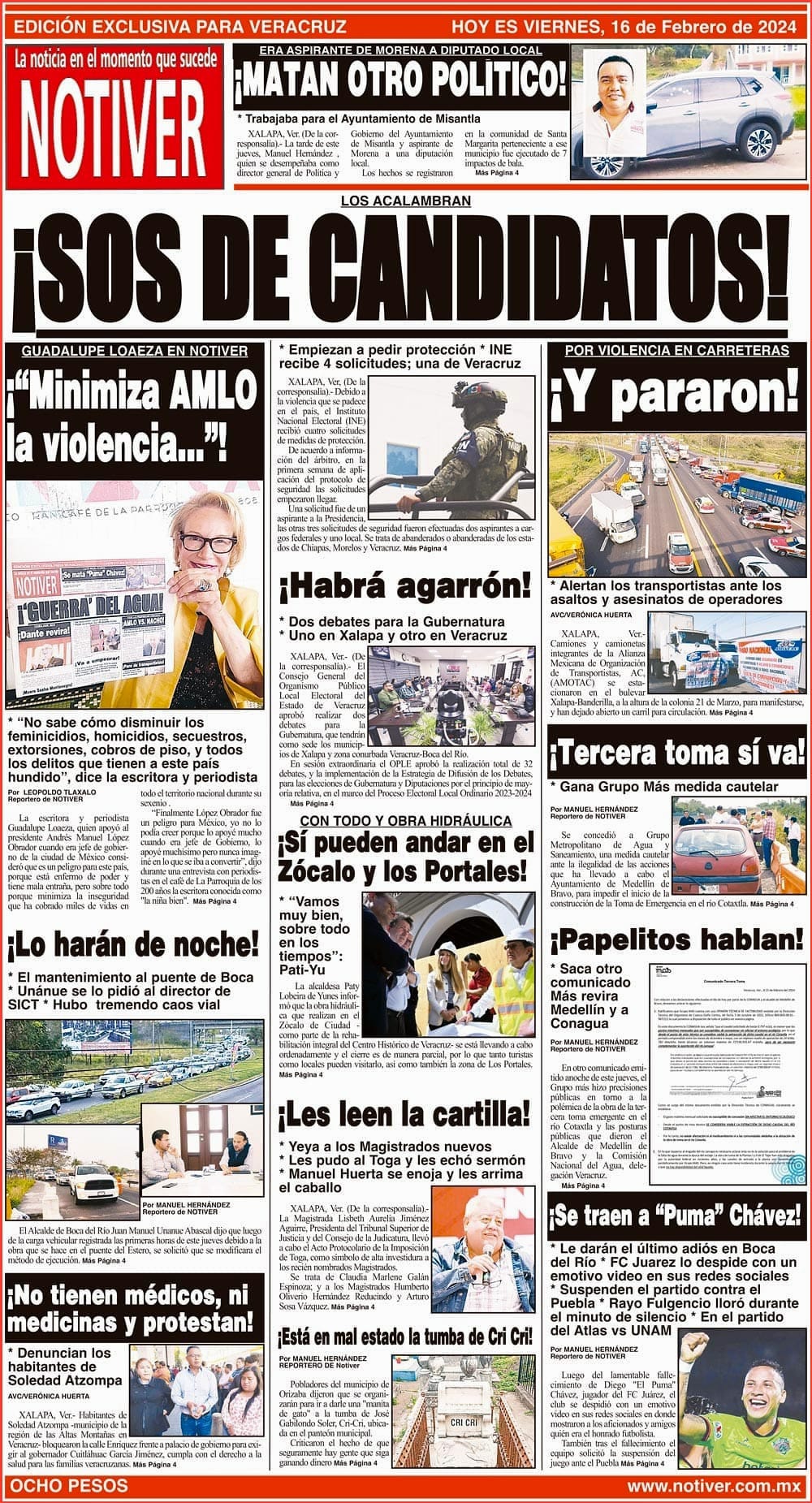 PRIMERA LA PORTADA - VIERNES 16 DE FEBRERO 2024 LOS ACALAMBRAN - * EMPIEZAN A PEDIR PROTECCIÓN * INE RECIBE 4 SOLICITUDES; UNA DE VERACRUZ 16 febrero 2024 Y LOS ANUNCIOS...Cotice su Anuncio Su Correo Electrónico: Texto: Enviar