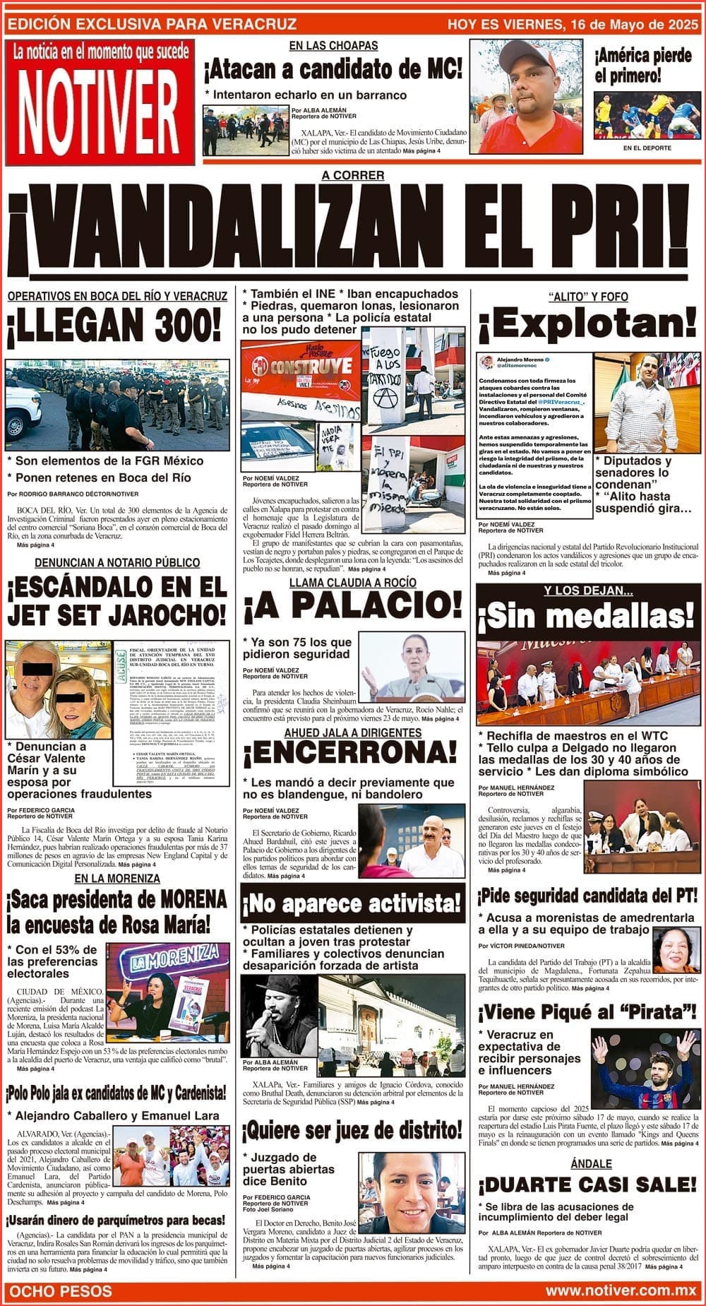 PRIMERA LA PORTADA - VIERNES 16 DE MAYO 2025 A CORRER - *TAMBIÉN EL INE *IBAN ENCAPUCHADOS *PIEDRAS, QUEMARON LONAS, LESIONARON A UNA PERSONA *LA POLICÍA ESTATAL NO LOS PUDO DETENER 16 mayo 2025