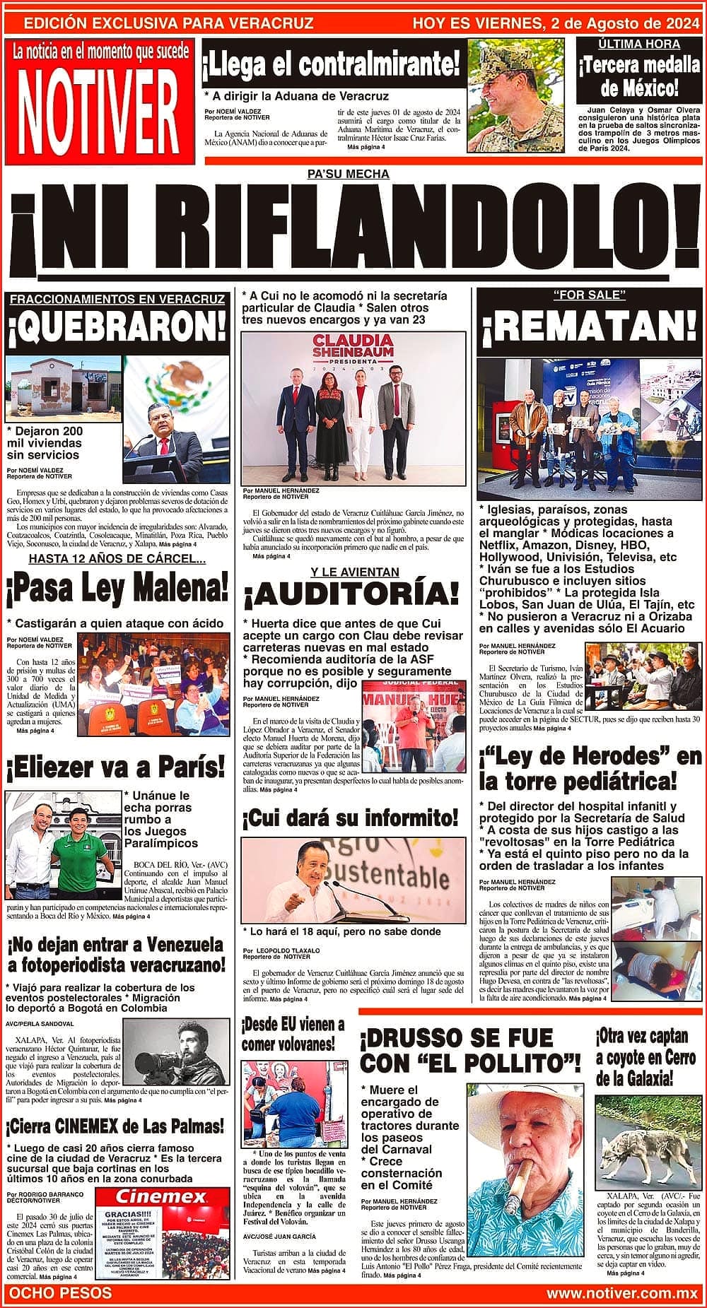 PRIMERA LA PORTADA - VIERNES 2 DE AGOSTO 2024 PA’SU MECHA - *A CUI NO LE ACOMODÓ NI LA SECRETARÍA PARTICULAR DE CLAUDIA *SALEN OTROS TRES NUEVOS ENCARGOS Y YA VAN 23 2 agosto 2024