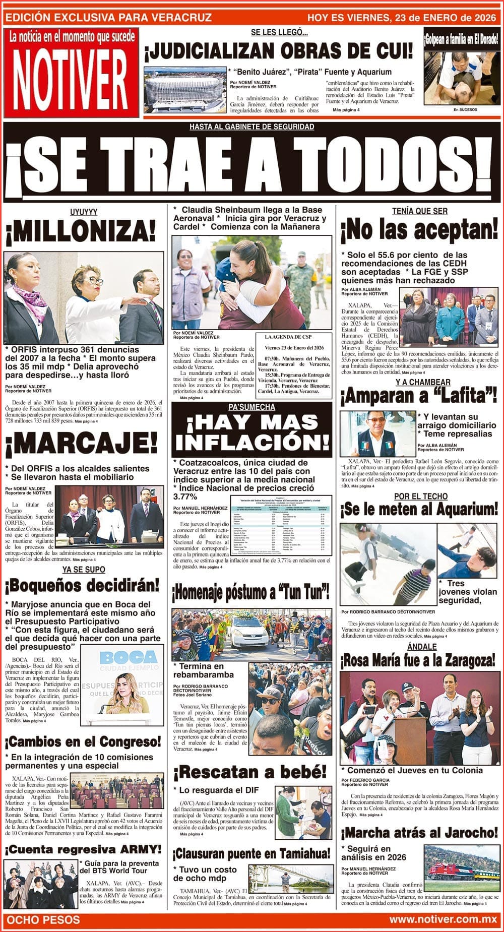 PRIMERA LA PORTADA - VIERNES 23 DE ENERO 2026 HASTA AL GABINETE DE SEGURIDAD - *CLAUDIA SHEINBAUM LLEGA A LA BASE AERONAVAL *INICIA GIRA POR VERACRUZ Y CARDEL *COMIENZA CON LA MAÑANERA 23 enero 2026