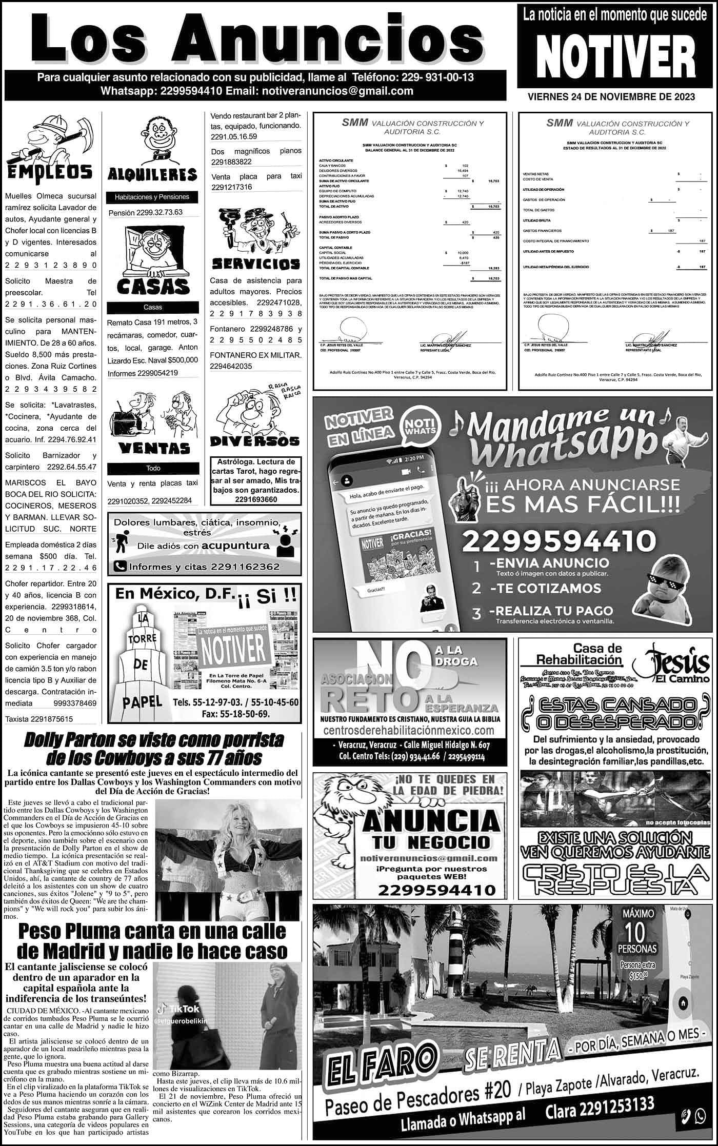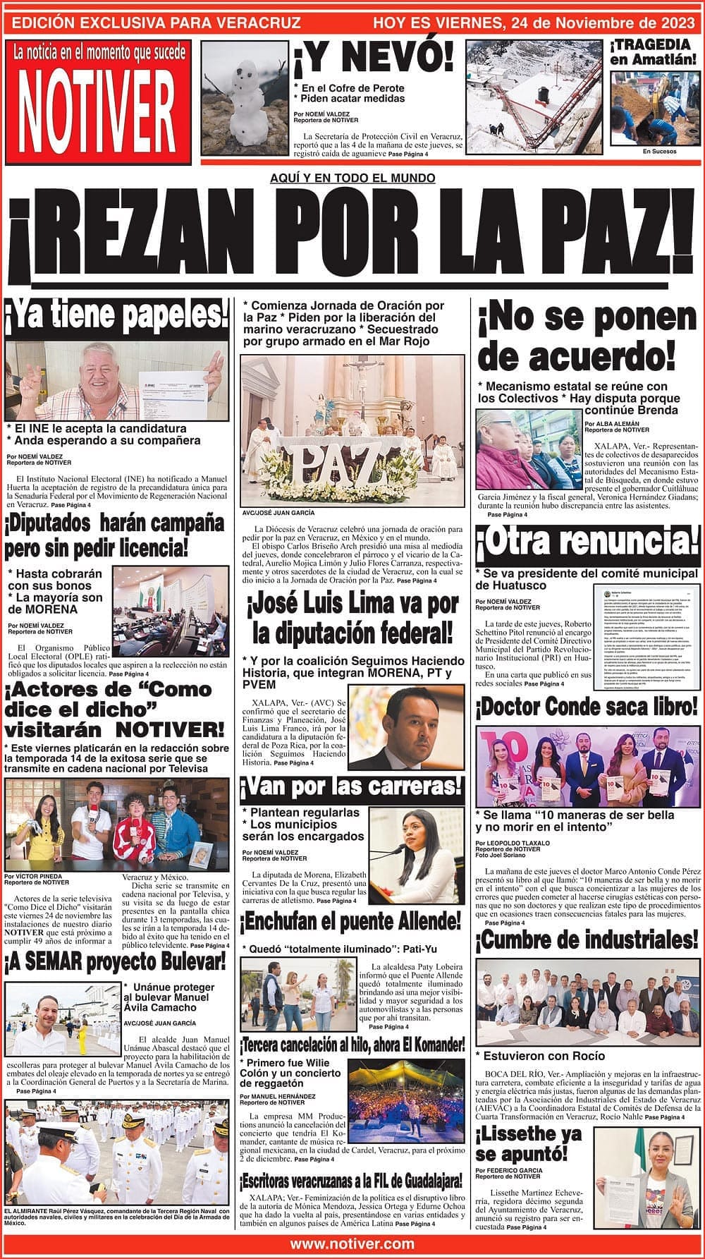 PRIMERA LA PORTADA - VIERNES, 24 DE NOVIEMBRE 2023 Y EN TODO EL MUNDO - * COMIENZA JORNADA DE ORACIÓN POR LA PAZ * PIDEN POR LA LIBERACIÓN DEL MARINO VERACRUZANO * SECUESTRADO POR GRUPO ARMADO EN EL MAR ROJO 24 noviembre 2023 Y LOS ANUNCIOS...Cotice su Anuncio Su Correo Electrónico: Texto: Enviar