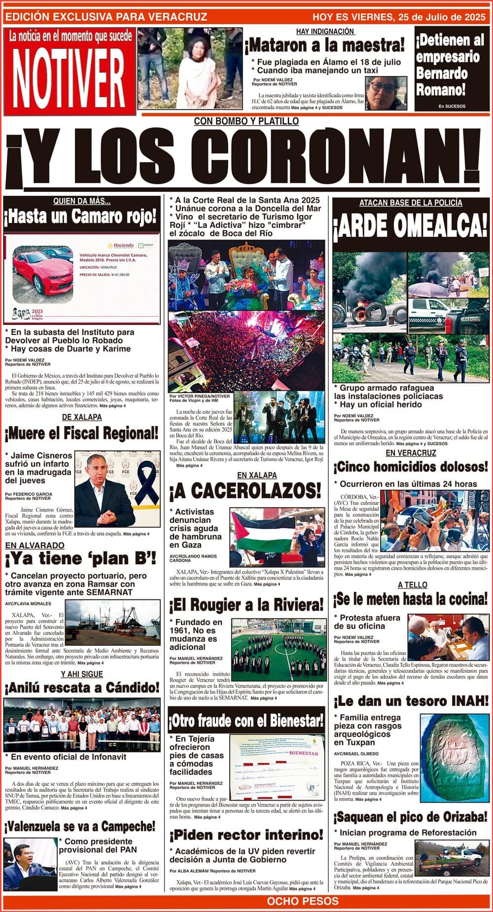 PRIMERA LA PORTADA - VIERNES 25 DE JULIO 2025 CON BOMBO Y PLATILLO - *A LA CORTE REAL DE LA SANTA ANA 2025 *UNÁNUE CORONA A LA DONCELLA DEL MAR *VINO EL SECRETARIO DE TURISMO IGOR ROJÍ *“LA ADICTIVA” HIZO "CIMBRAR" EL ZÓCALO DE BOCA DEL RÍO 25 julio 2025