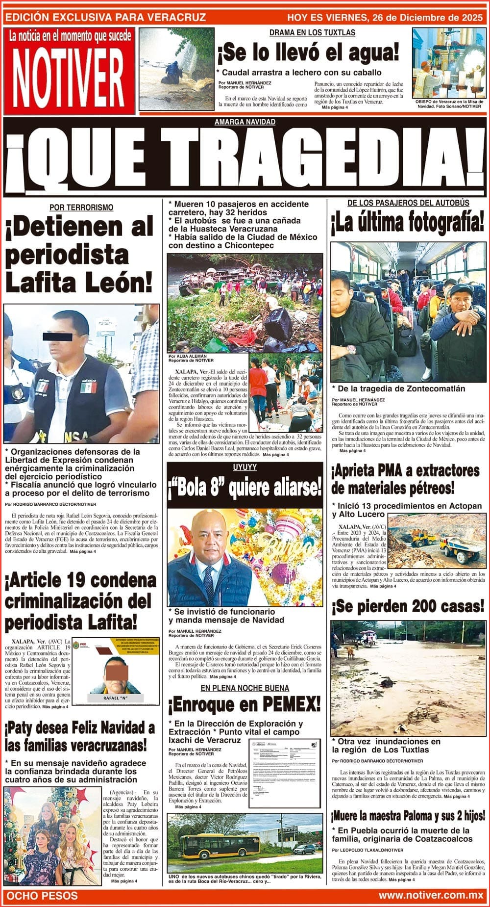 PRIMERA LA PORTADA - VIERNES 26 DE DICIEMBRE 2025 AMARGA NAVIDAD - *MUEREN 10 PASAJEROS EN ACCIDENTE CARRETERO, HAY 32 HERIDOS *EL AUTOBÚS SE FUE A UNA CAÑADA DE LA HUASTECA VERACRUZANA *HABÍA SALIDO DE LA CIUDAD DE MÉXICO CON DESTINO A CHICONTEPEC 26 diciembre 2025