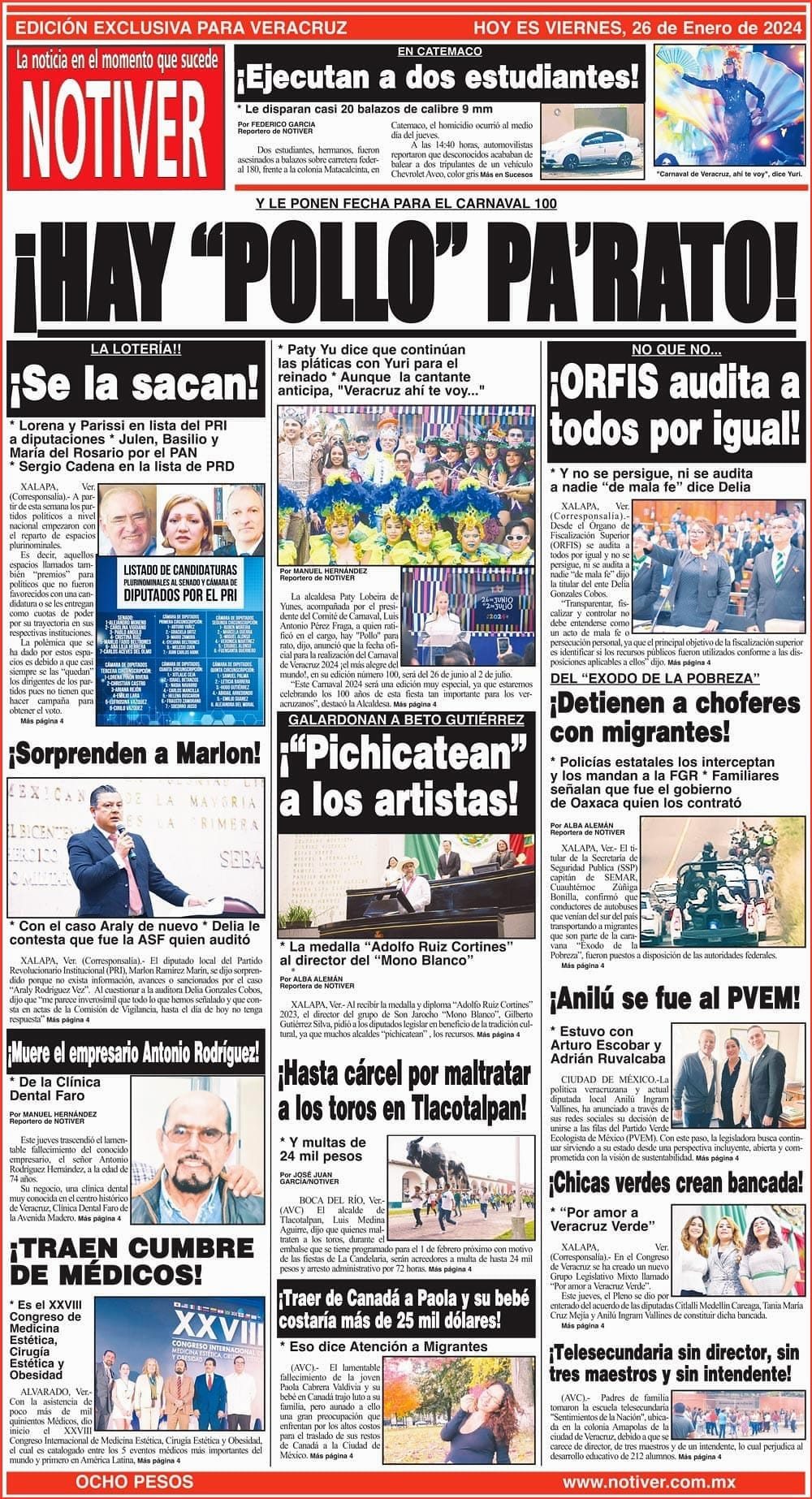 PRIMERA LA PORTADA - VIERNES 26 DE ENERO 2024 Y LE PONEN FECHA PARA EL CARNAVAL 100 -* PATY YU DICE QUE CONTINÚAN LAS PLÁTICAS CON YURI PARA EL REINADO * AUNQUE LA CANTANTE ANTICIPA, "VERACRUZ AHÍ TE VOY..." 26 enero 2024 Y LOS ANUNCIOS...Cotice su Anuncio Su Correo Electrónico: Texto: Enviar