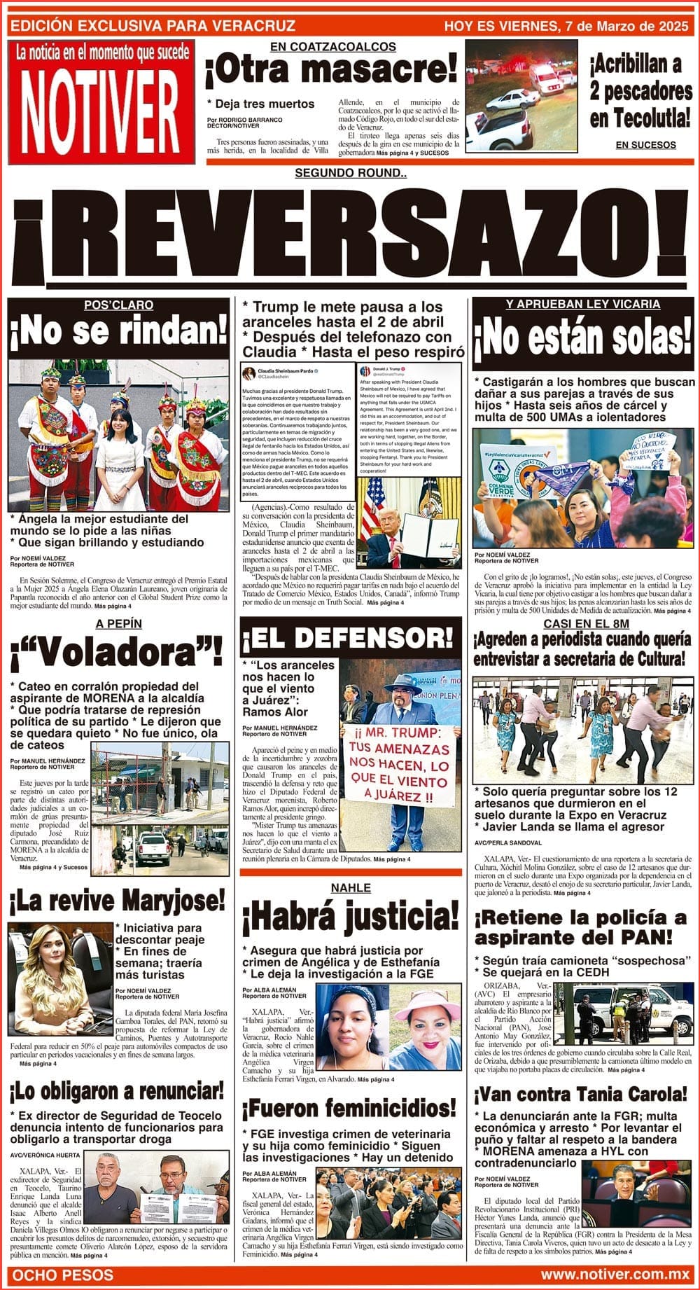 PRIMERA LA PORTADA - VIERNES 7 DE MARZO 2025 SEGUNDO ROUND… - *TRUMP LE METE PAUSA A LOS ARANCELES HASTA EL 2 DE ABRIL *DESPUÉS DEL TELEFONAZO CON CLAUDIA *HASTA EL PESO RESPIRÓ 7 marzo 2025